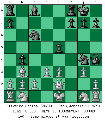 Last move : 1-0 2007 March 3 19:51:2 [Event "FICGS__CHESS__THEMATIC_TOURNAMENT__000020"] [Site "FICGS"] [Date "2006.12.22"] [Round "1"] [White "Oliveira,Carlos"] [Black "Pech,Jaroslav"] [Result "1-0"] [WhiteElo "2027"] [BlackElo "1929"] 1.e4 e5 2.Bb5 c6 3.Ba4 Nf6 4.Nc3 b5 5.Bb3 b4 6.Nb1 d5 7.exd5 Bc5 8.dxc6 Nxc6 9.d3 O-O 10.Be3 Bxe3 11.fxe3 Ng4 12.Qe2 Qh4+ 13.g3 1-0 King's pawn game Kingside Castling by player Black (move 9) Player White won this chess game. Follow this game move after move (download)He who fears an isolated Queen's Pawn should give up Chess. (Siegbert Tarrasch) Nach Morphy wurde nichts neues mehr in der Behandlung offener Positionen gefunden. (Mikhail Moiseyevich Botvinik) Debes de llevar a tu oponente hacia un profundo y obscuro bosque donde 2+2=5, y el camino que conduce a la salida es suficientemente ancho para solamente uno. (Mikhail Tal) Il s'avisa de me proposer d'apprendre les échecs qu'il jouait un peu... me voilà forcené des échecs. J'achète un échiquier, je m'enferme dans ma chambre, j'y passe des jours et des nuits à vouloir apprendre par cur toutes les parties. (Jean-Jacques Rousseau, Confessions) A government big enough to give you everything you want is strong enough to take everything you have. (Thomas Jefferson)
