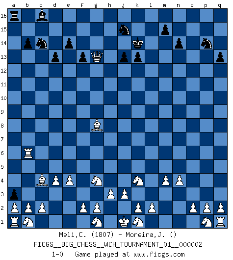Last move : 1-0 2011 August 6 21:26:22 [Event "FICGS__BIG_CHESS__WCH_TOURNAMENT_01__000002"] [Site "FICGS"] [Date "2011.05.10"] [Round "1"] [White "Meli,Cosimo Leonardo"] [Black "Moreira,Jose"] [Result "1-0"] [WhiteElo "1807"] [BlackElo ""] 1.j2-k4 g15-g13 2.h1-o7 h16-c11 3.e2-e4 d15-d13 4.o7-o15 p16-o14 5.o15-f7 f15-f13 6.m2-m4 n15-n14 7.n2-n4 c11-c7 8.f7-c7 c15-c13 9.c7-l15 j15-l14 10.l15-c7 j14-j13 11.c7-c13 e15-e14 12.c13-k6 a15-a13 13.d2-d4 a13-a12 14.h2-g4 a12-a11 15.c1-k8 b16-c14 16.l1-o4 a11-a10 17.f1-c4 a10-a9 18.o1-g8 a9-a8 19.e1-e3 a8-a7 20.m1-m3 a7-a6 21.m3-p3 p15-p14 22.k8-p13 q15-q14 23.p13-o14 o16-g9 24.k6-g9 a6-a5 25.o14-m16 q16-m16 26.p3-p14 q14-q13 27.e3-b3 a5-a4 28.b3-b6 m16-o16 29.g9-o16 a4-a3 30.o16-l16 l14-n15 31.l16-l10 k15-k13 32.l10-e16 g16-j15 33.o4-d14 n15-p14 34.d14-f16 j16-k15 35.f16-h14 k15-j14 36.h14-g13 h15-g13 37.e16-k16 b15-b14 38.k16-g16 j14-k14 39.g16-g13 1-0 This big chess game has been lost on time (started : 2011.05.10 11:22:40) Follow this game move after move (download)Via the squares on the chessboard, the Indians explain the movement of time and the age, the higher influences which control the world and the ties which link Chess with the human soul. (Al-Masudi) Es ist besser die Steine des Gegners zu opfern. (Savielly Grigorievitsch Tartakower) Si el Ajedrez es una ciencia, es la mas inexacta. Si el Ajedrez es un arte, es demasiado inexacto para ser visto como tal. Si el Ajedrez es un deporte, es demasiado esotérico. Si el Ajedrez es un juego, es demasiado exigente para ser solo un juego. Si el Ajedrez es una aventura, es una muy demandante. Si el Ajedrez es una pasión, es una muy gratificante. Si el Ajedrez es la vida, es una muy triste. (Anónimo) Ce qui caractérise les parties de combat, c'est que si le défenseur a constamment de difficiles problèmes à résoudre, l'attaquant doit chercher sans relâche de nouvelles possibilités d'attaque. (Koblentz) A generalist learns less and less about more and more until he knows nothing about everything. (Author unknown)