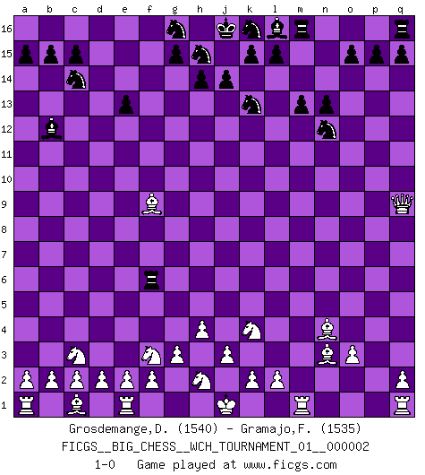 Last move : 1-0 2011 May 12 9:6:4 [Event "FICGS__BIG_CHESS__WCH_TOURNAMENT_01__000002"] [Site "FICGS"] [Date "2011.05.10"] [Round "1"] [White "Grosdemange,David"] [Black "Gramajo,Francisco"] [Result "1-0"] [WhiteElo "1540"] [BlackElo "1535"] 1.j2-k4 p16-o14 2.g1-f3 j15-k13 3.m2-m4 n15-n13 4.b1-c3 h16-o10 5.h3-h4 o10-o2 6.p1-o3 o16-g9 7.k1-l3 d15-d13 8.l3-n4 g9-m4 9.n4-o2 m4-o2 10.n2-n3 c16-p4 11.h1-q9 e15-e13 12.k4-m3 p4-o3 13.p2-o3 o2-n3 14.l1-n3 b16-c14 15.g2-g3 m15-m13 16.f1-l6 o14-n12 17.l6-d13 f16-b12 18.d13-f15 e16-f16 19.f15-p6 f16-f6 20.p6-n4 a16-f16 21.m3-k4 f16-f9 22.o1-f9 1-0 Follow this game move after move (download)The Pawns are the soul of the game. (Francois Andre Danican Philidor) Ich möchte Schüler heranbilden, die das Vermögen haben, selbst zu denken und Kritik zu üben. (Emanuel Lasker) Muchos jugadores de Ajedrez se sorprendían cuando después de la partida, Fischer explicaba con calma: 'Yo ya había analizado esta posibilidad' en una posición en la cual yo creía que no era posible de prever desde la apertura. (Mikhail Tal) Un footballeur joue avec ses pieds, parfois avec sa tête. Un joueur d'échecs ne joue qu'avec sa tête. Et quand il ne joue plus, il meurt. (Jacob Murray) Only sick music makes money today. (Friedrich Nietzsche)