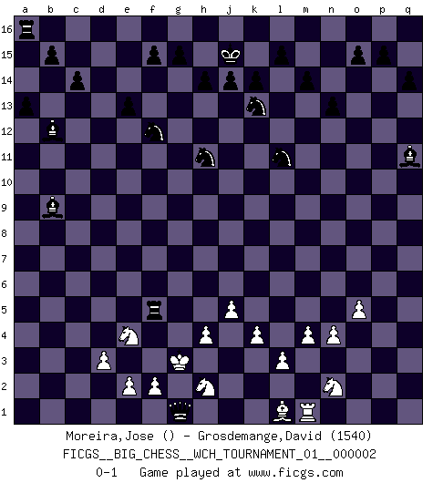 Last move : 0-1 2011 July 8 22:9:4 [Event "FICGS__BIG_CHESS__WCH_TOURNAMENT_01__000002"] [Site "FICGS"] [Date "2011.05.10"] [Round "1"] [White "Moreira,Jose"] [Black "Grosdemange,David"] [Result "0-1"] [WhiteElo ""] [BlackElo "1540"] 1.k2-k4 j15-k13 2.j3-j4 p16-o14 3.g2-g4 g16-f14 4.h1-c6 e15-e13 5.c6-c15 b16-c14 6.n2-n4 f14-d13 7.c15-c14 d15-c14 8.m2-m4 n15-n13 9.q2-q4 o16-j11 10.p2-p4 c16-p4 11.o2-o3 p4-e14 12.h2-f3 h16-k14 13.o1-d11 d13-f12 14.d11-h15 k16-h15 15.h3-h4 k14-c7 16.j2-g3 c7-c2 17.d2-d3 c2-c11 18.l2-l3 m15-m14 19.o3-o4 l16-n14 20.c1-d2 f16-b12 21.q4-q5 j16-j15 22.q5-q6 o14-m13 23.q6-q7 m13-l11 24.q7-q8 e16-d16 25.q8-q9 d16-d9 26.q9-q10 m16-d16 27.q10-q11 h15-j13 28.q11-q12 d9-p9 29.q12-q13 q15-q14 30.a2-a4 k15-k14 31.a4-a5 d16-d9 32.a5-a6 p9-q9 33.q1-q9 d9-q9 34.a6-a7 q9-q13 35.a7-a8 q16-d16 36.a8-a9 e14-a10 37.j4-j5 q13-q9 38.b1-c3 a15-a13 39.b2-b4 j11-l9 40.b4-b5 l9-d2 41.e1-c1 d2-c1 42.a1-c1 q9-a9 43.b5-b6 a9-c9 44.b6-b7 c9-c3 45.c1-c3 c11-c3 46.f3-g5 a10-g4 47.k1-h2 g4-b9 48.f1-h3 b9-h3 49.p1-n2 h3-b9 50.o4-o5 j13-h11 51.b7-b8 d16-d8 52.g5-e4 c3-c1 53.j1-h1 d8-b8 54.h1-g2 n14-q11 55.g2-f3 b8-f8 56.g3-f5 f8-f5 57.f3-g3 c1-g1 0-1 Follow this game move after move (download)The battle for the ultimate truth will never be won. And that's why Chess is so fascinating. (Hans Kmoch) Die jungen Leute sollen verstehen, dass sie noch etwas von mir lernen können und müssen. (Viktor Kortschnoi) Mis oponentes también hacen buenas movidas. A veces yo no tomo esas cosas en consideración. (Bobby Fischer) Même si l'adversaire joue le coup analysé précédemment, recommencez l'analyse en voyant la nouvelle position. Première règle de Blumenfeld Experience is the name we all give to our mistakes. (Oscar Wilde)