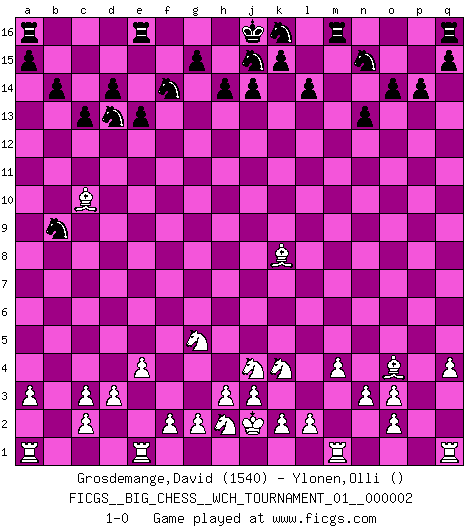 Last move : 1-0 2011 May 21 1:34:13 [Event "FICGS__BIG_CHESS__WCH_TOURNAMENT_01__000002"] [Site "FICGS"] [Date "2011.05.10"] [Round "1"] [White "Grosdemange,David"] [Black "Ylonen,Olli"] [Result "1-0"] [WhiteElo "1540"] [BlackElo ""] 1.j2-k4 e15-e13 2.h1-o7 o15-o14 3.o7-f15 h15-f14 4.m2-m4 h16-h15 5.b1-c3 e16-e14 6.f15-f16 e14-e16 7.f16-a11 b15-b14 8.p1-o3 c15-c13 9.l1-o4 b16-c14 10.n2-n3 c16-b15 11.e2-e4 c14-d12 12.f1-c4 b15-o3 13.p2-o3 p15-p14 14.d2-d3 n15-n13 15.c1-k8 d15-d14 16.g1-f3 g16-e15 17.k1-l3 e15-d13 18.f3-g5 m15-m13 19.o1-g8 l16-n14 20.q2-q4 m16-n16 21.g8-m13 n14-m13 22.c4-m13 l15-l14 23.m13-b3 d12-b13 24.a11-b11 b13-c11 25.l3-j4 h15-b9 26.b11-b9 c11-b9 27.j1-j2 o16-b4 28.a2-a3 b4-c3 29.b2-c3 p16-n15 30.b3-f7 n16-m16 31.f7-c10 1-0 Follow this game move after move (download)Fischer is the strongest player in the world. In fact, the strongest player who ever lived. (Larry Evans) Im Schach nämlich geht es darum, daß Ich des Gegners klein zu kriegen, sein Ego zu zerbrechen und zu zermahlen, seine Selbstachtung zu zertreten und zu verscharren und seine ganze mißachtenswerte sogenannte Persönlichkeit ein für alle Mal tot zu hacken und zu zerstampfen und dadurch die menschliche Gesellschaft von einer stinkenden Pestbeule zu befreien. Es ist ein königliches Spiel. (Robert James Fischer) El Ajedrez es tan interesante por sí solo, que no es necesario un interés monetario para persuadir a una persona a que lo practique; por lo tanto, nunca se juega por dinero. (Benjamin Franklin) Je fais ceci parce que dans cinquante coups j'obtiendrai cela; je m'appelle Mikhail Moisevitch Botvinnik. (Botvinnik) Dave, my mind is going. I can feel it. (HAL 9000 in 2001, a space odyssey)