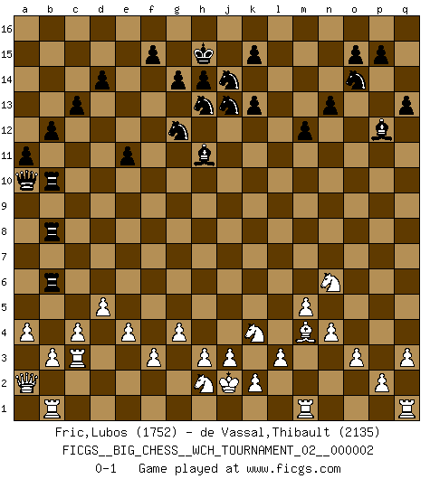 Last move : 0-1 2011 November 15 8:24:55 [Event "FICGS__BIG_CHESS__WCH_TOURNAMENT_02__000002"] [Site "FICGS"] [Date "2011.05.10"] [Round "1"] [White "Fric,Lubos"] [Black "de Vassal,Thibault"] [Result "0-1"] [WhiteElo "1752"] [BlackElo "2135"] 1.j2-k4 g15-g14 2.h1-o7 h16-c11 3.e2-e4 m15-m13 4.m2-m4 h15-g13 5.h2-g4 e15-e13 6.n2-n4 p16-o14 7.b1-c3 l16-p12 8.k1-h2 n15-n14 9.l1-p5 k16-h15 10.d2-d4 c11-b11 11.o7-c7 j15-k13 12.f1-b5 b11-d13 13.b5-k13 j14-k13 14.c7-l15 m16-n16 15.m4-m5 g13-j14 16.l15-n13 f16-c13 17.o2-o3 o16-g9 18.p1-n2 q15-q14 19.d4-d5 h15-j13 20.f2-f3 d15-d14 21.g1-j2 c16-h11 22.k4-l6 b16-d15 23.j2-k4 d15-f14 24.n2-o4 f14-g12 25.o1-m3 g16-f14 26.c1-l9 f14-h13 27.j1-j2 d13-b11 28.a1-b1 e13-e12 29.b2-b3 c13-f10 30.c3-a4 e16-e13 31.c2-c4 c15-c13 32.m3-k5 b15-b13 33.k5-j4 b11-c12 34.e1-c1 n16-l16 35.l9-e15 e13-e14 36.e15-n7 a15-a13 37.a4-c3 j16-h15 38.c3-e2 a13-a12 39.e2-f4 a12-a11 40.n13-d4 b13-b12 41.n7-k10 g9-n15 42.k10-g7 j13-l14 43.g4-j5 m13-m12 44.f4-e6 n15-j11 45.p5-k10 n14-n13 46.j5-g6 c12-a10 47.a2-a4 l14-j13 48.k10-h8 e14-f14 49.e6-f8 f10-h8 50.g7-h8 j11-f8 51.g6-f8 f14-f8 52.h8-m4 l16-l10 53.j4-g6 l10-o10 54.o4-n6 e12-e11 55.d4-g7 f8-f14 56.g7-l7 a16-l16 57.l7-m6 q14-q13 58.l6-m8 a10-a6 59.m6-k6 f14-f6 60.m8-l6 o10-g10 61.l6-j7 f6-g6 62.j7-g6 g10-g6 63.k6-f2 l16-l8 64.c1-c3 l8-b8 65.l2-l3 q16-l16 66.g2-g4 l16-l10 67.q2-q3 l10-b10 68.f2-c2 g6-b6 69.c2-a2 a6-a10 0-1 Follow this game move after move (download)In order to improve your game, you must study the endgame before everything else, for whereas the endings can be studied and mastered by themselves, the middle game and the opening must be studied in relation to the endgame. (Jose Raul Capablanca) Ich kämpfe solange mein Gegner einen Fehler machen kann. (Emanuel Lasker) El Ajedrez es realmente noventa y nueve por ciento calculación. (Soltis) Des combinaisons [dans le jeu d'échecs] pareilles à des mélodies. Je crois entendre pour ainsi dire la musique des coups... (Vladimir Nabokov) When a man with money meets a man with experience, the man with experience leaves with money and the man with money leaves with experience. (Anonymous)