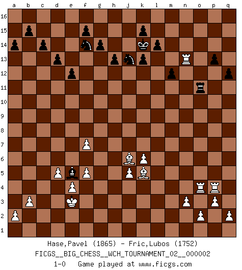 Last move : 1-0 2011 November 15 8:25:39 [Event "FICGS__BIG_CHESS__WCH_TOURNAMENT_02__000002"] [Site "FICGS"] [Date "2011.05.10"] [Round "1"] [White "Hase,Pavel"] [Black "Fric,Lubos"] [Result "1-0"] [WhiteElo "1865"] [BlackElo "1752"] 1.k2-k4 j15-k13 2.p1-o3 h16-o10 3.h2-g4 o10-l10 4.k1-l3 l10-c2 5.b1-c3 c2-g6 6.j3-j4 m15-m13 7.g1-f3 h15-g13 8.j2-h4 g6-p6 9.h1-k3 e15-e13 10.p2-p3 d15-d13 11.o1-p2 c15-c14 12.m2-m4 l16-p12 13.o3-n5 p6-e6 14.g4-e5 c16-l8 15.g2-g4 n15-n13 16.k3-o7 o15-o14 17.d2-d4 o16-f8 18.l1-j3 f16-b12 19.j4-j5 f8-d6 20.c1-l9 k16-h15 21.f1-l6 l8-m9 22.o7-j7 e6-b9 23.b2-b3 d6-b4 24.e1-c1 b12-f8 25.l6-j8 f8-g9 26.j7-h6 b4-f8 27.h6-o6 b9-b14 28.n2-n3 e13-e12 29.l3-k5 g13-j12 30.n5-m7 b14-b11 31.j1-k2 m13-m12 32.m7-k8 m9-o11 33.k8-h7 f8-a3 34.h7-g9 a3-g9 35.o6-g6 b11-g6 36.j8-g6 g9-a3 37.c1-c2 k13-l11 38.p2-j8 q15-q13 39.h4-f5 o11-p10 40.l2-l4 b16-d15 41.a1-b1 a3-b4 42.c3-d5 b4-g9 43.e5-f7 g9-b14 44.j3-g5 p12-q11 45.f3-h4 g16-f14 46.f7-e9 e16-e13 47.e9-c8 e13-k13 48.c2-c7 p10-k5 49.l4-k5 q11-k5 50.h4-k5 k13-k5 51.k2-j3 m16-m13 52.m4-m5 j16-j15 53.l9-k8 l11-j10 54.f5-h4 k5-k8 55.g5-k8 j10-k8 56.c7-k7 k8-j10 57.j8-n12 m13-k13 58.k7-k13 j14-k13 59.m1-l1 l15-l14 60.h4-j6 j10-l11 61.n12-l10 h15-g13 62.j6-k8 p16-n15 63.m5-m6 b14-c15 64.k8-m9 c15-m6 65.m9-l11 j12-l11 66.c8-e9 a16-j16 67.j3-j4 j15-k14 68.d5-e7 n15-m13 69.e7-g8 g15-g14 70.l1-l6 m6-c15 71.e9-g10 g13-f11 72.k4-k5 p15-p13 73.k5-k6 q13-q12 74.q1-l1 j16-j13 75.h3-h4 q16-j16 76.j4-h3 m13-k12 77.l10-h7 k12-j10 78.h7-k5 j13-h13 79.h3-g3 c15-g11 80.f2-f4 j10-g9 81.e2-e4 d15-e13 82.g6-d9 j16-j10 83.g10-f8 a15-a14 84.g8-e7 g11-d8 85.e7-g6 j10-h10 86.g4-g5 d8-e9 87.f8-e10 g9-e10 88.d9-e10 h13-g13 89.f4-f5 f11-g9 90.e10-j6 l11-j10 91.l6-l8 h10-d10 92.d4-d5 e9-c7 93.g3-g4 g9-f7 94.l8-o8 d10-e10 95.j6-e10 j10-g9 96.e10-j6 f7-e5 97.g6-e5 c7-e5 98.o8-o14 g9-e8 99.o14-o13 e8-f6 100.g4-f3 g13-h13 101.g5-f6 h13-h4 102.b1-h1 h4-f4 103.f3-e3 h14-h13 104.o13-n13 f4-p4 105.l1-l4 p4-p11 106.f6-f7 e13-g12 107.h1-h4 g12-j13 108.l4-p4 p11-o11 109.h4-o4 1-0 Follow this game move after move (download)A thorough understanding of the typical mating continuations makes the most complicated sacrificial combinations leading up to them not only not difficult, but almost a matter of course. (Siegbert Tarrasch) Gewinnen beim Schach fördert das Selbstvertrauen. Beim Sex spüre ich sowas nicht... (Garry Kasparov) Un jugador que trata de regresar una movida en el Ajedrez es un futuro carterista. (Richard Fenton) La conception d'un plan est le processus par lequel un joueur exploite les avantages de sa position tout en s'efforçant d'en réduire au minimum les inconvénients. Afin de garantir le succès, un plan doit toujours se fonder sur un diagnostic objectif des particularités d'une position. La conception d'un plan est d'autant plus difficile que la position est équilibrée, et grandement facilitée lorsqu'il n'existe qu'un seul plan susceptible de répondre aux exigences de la position. (Harry Golombek) Establishing goals is all right if you don't let them deprive you of interesting detours. (Doug Larson)