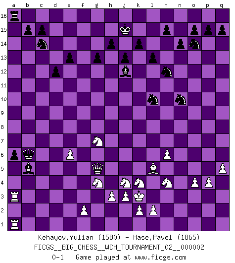 Last move : 0-1 2011 October 20 0:20:11 [Event "FICGS__BIG_CHESS__WCH_TOURNAMENT_02__000002"] [Site "FICGS"] [Date "2011.05.10"] [Round "1"] [White "Kehayov,Yulian"] [Black "Hase,Pavel"] [Result "0-1"] [WhiteElo "1580"] [BlackElo "1865"] 1.j2-k4 b16-c14 2.h1-o7 p16-o14 3.o7-f15 g16-f14 4.f15-l10 k16-l14 5.d2-d4 e15-e13 6.e2-e4 d15-d13 7.c1-l9 g15-g13 8.m2-m4 k15-k14 9.n2-n4 j14-j13 10.o1-g8 n15-n14 11.l1-p5 c16-g12 12.f1-c4 j15-k13 13.m1-m3 f14-h13 14.e1-e3 f16-b12 15.g1-j2 b12-f8 16.b1-a3 h16-f16 17.e3-f3 f16-a11 18.h2-g4 e16-f16 19.a1-e1 l16-j14 20.g8-k11 o16-j11 21.l9-j11 h13-j11 22.l10-k10 a11-a5 23.c2-c3 l14-m12 24.k11-d5 f8-d6 25.k1-h2 f16-f3 26.g2-f3 a16-f16 27.p1-o3 j16-j15 28.j2-h4 f16-f10 29.k10-g7 d13-d12 30.m3-l3 l15-l13 31.e4-e5 d6-f8 32.g7-k7 m16-f16 33.h4-g6 f8-a3 34.b2-a3 a5-c3 35.j1-j2 c3-d4 36.f3-f4 d4-c5 37.a3-a4 g12-f11 38.k7-n7 f10-n10 39.n7-p7 q16-p16 40.q1-m1 f11-n4 41.m1-n1 n4-g10 42.p7-o7 j14-h13 43.o7-g7 h13-j12 44.n1-n10 m12-n10 45.g6-h8 g10-a4 46.p5-j11 c5-c8 47.j11-n7 f16-f4 48.n7-l5 f4-c4 49.d5-c4 c8-c4 50.g7-g5 c4-a2 51.j2-k3 a4-e8 52.h2-j4 a2-b3 53.e1-e3 b3-b11 54.m4-m5 k13-m12 55.q2-q3 h15-f14 56.p2-p4 f14-h13 57.o3-m4 a15-a13 58.l3-n3 a13-a12 59.h8-j6 h13-k12 60.n3-l3 k12-l10 61.o2-o4 a12-a11 62.j6-g7 e8-g10 63.m5-m6 a11-a10 64.q3-q4 a10-a9 65.q4-q5 a9-a8 66.l3-n3 a8-a7 67.n3-n1 a7-a6 68.n1-a1 p16-a16 69.e3-a3 g10-b5 70.e5-e6 b11-b6 0-1 This big chess game has been lost on time (started : 2011.05.10 11:25:58) Follow this game move after move (download)You know, comrade Pachman, I don't enjoy being a Minister, I would rather play Chess like you. (Che Guevara) Nach Morphy wurde nichts neues mehr in der Behandlung offener Positionen gefunden. (Mikhail Moiseyevich Botvinik) Las combinaciones han sido siempre el aspecto más intrigante del Ajedrez. Los Maestros las buscan, el público las aplauden, los críticos las alaban. La razón se debe a que las combinaciones hacen posible que el Ajedrez sea más que un ejercicio matemático con una carencia de vida. Ellas son la poesía del juego, son del Ajedrez lo que la melodía es de la música. Ellas representan el triunfo de la mente sobre la materia. (Reuben Fine) Vous m'avez demandé de vous exposer quel est le fondement de la prière. Je ne fais que préparer les pièces du jeu sur la table... Nous sera-t-il permis d'en adopter les règles et si nous les appliquons scrupuleusement nous ne tarderons pas à faire mat le Roi divin ! Il ne pourra échapper à nos mains. (Sainte Thérèse d'Avila, Chemin de perfection) It's only after you lost everything, Tyler says, that you're free to do anything. (Chuck Palahniuk, Fight Club)