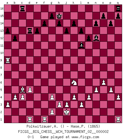 Last move : 0-1 2011 November 10 8:50:0 [Event "FICGS__BIG_CHESS__WCH_TOURNAMENT_02__000002"] [Site "FICGS"] [Date "2011.06.01"] [Round "1"] [White "Polkwitzauer,Ardiantez"] [Black "Hase,Pavel"] [Result "0-1"] [WhiteElo ""] [BlackElo "1865"] 1.j2-k4 h15-g13 2.h1-o7 p16-o14 3.b1-c3 b16-c14 4.p1-o3 e15-e13 5.e2-e4 d15-d13 6.p2-p3 m15-m13 7.o1-p2 c16-e14 8.d2-d4 n15-n14 9.c1-e3 l16-m15 10.a2-a3 m15-h11 11.m2-m4 f16-c13 12.l1-o4 h16-h15 13.g1-f3 h15-a8 14.f1-d3 c13-b12 15.d4-d5 h11-n6 16.o7-h7 e14-k9 17.h7-a7 a8-g8 18.e1-g1 o16-f8 19.k4-m3 f8-d10 20.a7-l7 k16-l14 21.o3-p5 n6-l8 22.p2-d13 g16-f14 23.d13-p2 a16-d16 24.o4-m2 d10-f12 25.l7-g3 g8-g3 26.f2-g3 d16-d14 27.p2-c14 b12-m2 28.c14-e16 f14-e16 29.k1-m2 e16-f14 30.g3-g4 f14-h13 31.m2-k3 j16-h15 32.n2-n4 l14-k12 33.j1-j2 j15-k13 34.o2-o4 l15-l13 35.e3-b6 m16-d16 36.f3-h4 h13-g11 37.a1-d1 g13-j12 38.h4-f5 k13-j11 39.h2-j4 j11-h9 40.j4-k6 l8-p4 41.m1-n1 a15-a13 42.q2-q3 p4-q5 43.p3-p4 q5-l10 44.g1-f1 g11-f9 45.n4-n5 k12-j10 46.d3-b5 f9-g7 47.k3-h4 j12-g11 48.f5-g7 h9-g7 49.h4-f5 g11-h9 50.b6-d4 g7-j6 51.m3-l5 j10-k8 52.l5-j6 k8-j6 53.k6-h5 m13-m12 54.b5-d3 f12-g13 55.f5-g7 h9-g7 56.h5-g7 j6-g5 57.p5-n4 f15-f14 58.l2-l3 g5-e4 59.d3-e4 k9-e4 60.c3-e4 l10-e4 61.c2-c4 e4-n12 62.b2-b4 o14-m13 63.d4-c5 k15-k14 64.n4-l5 m13-l11 65.k2-k4 l11-m9 66.g7-h5 c15-c13 67.l5-j4 c13-c12 68.f1-f9 m9-l7 69.c5-f2 l7-m5 70.o4-o5 g13-q4 71.n1-f1 c12-c11 72.f2-j5 b15-b13 73.j5-c11 b13-b12 74.c11-e9 j14-j13 75.o5-o6 q4-p5 76.h5-k6 m5-k6 77.j4-k6 p5-q6 78.q3-q4 q6-k12 79.e9-f8 k12-l11 80.f8-c5 d16-c16 81.p4-p5 p15-p14 82.f9-a9 d14-d13 0-1 Follow this game move after move (download)An attack on the wing should be met by play in the center. (Nimzovitch) Der Schachmeister von Heute braucht Courage, einen Killerinstinkt, Ausdauer und Arroganz. (Larry Evans) Repentinamente, me resultaba obvio en mi analisis que yo había pasado por alto lo que Fischer había visto en el tablero con la mas grande facilidad. (Mikhail Botvinnik) Un journaliste : 'Vous préférez avoir une dame de plus sur l'échiquier ou au lit ?' Boris Spassky : 'Ca dépend de la position.' Tree pose grows confidence. It roots me to this world. (Terri Guillemets)