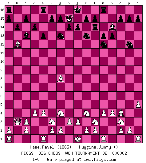 Last move : 1-0 2011 August 15 2:5:3 [Event "FICGS__BIG_CHESS__WCH_TOURNAMENT_02__000002"] [Site "FICGS"] [Date "2011.05.10"] [Round "1"] [White "Hase,Pavel"] [Black "Huggins,Jimmy"] [Result "1-0"] [WhiteElo "1865"] [BlackElo ""] 1.b1-c3 j15-k13 2.p1-o3 b15-b14 3.g1-f3 c16-b15 4.h2-g4 e15-e13 5.k1-l3 k16-l14 6.j2-k4 f16-c13 7.h1-o7 h15-g13 8.n2-n3 p16-o14 9.d2-d4 g16-f14 10.e2-e4 b16-a14 11.o7-o8 n15-n13 12.o1-a14 b15-a14 13.o8-a8 h16-h15 14.a8-a14 m15-m13 15.f1-c4 l16-o13 16.c4-g8 o16-b4 17.m2-m3 f14-d13 18.n3-n4 d13-b12 19.a14-a4 b4-c3 20.b2-c3 q16-n16 21.c1-h6 l14-m12 22.l1-o4 d15-d14 23.m3-m4 n16-n14 24.q2-q4 n14-l14 25.q4-q5 o14-p12 26.a4-b3 o13-n14 27.h6-b12 1-0 Follow this game move after move (download)A Chess game is divided into three stages: the first, when you hope you have the advantage, the second when you believe you have an advantage, and the third... when you know you're going to lose ! (Savielly Tartakower) Im Schach gewinnt jeder. Hat man Freunde am Spiel - und das ist die Hauptsache - ist auch der Verlust einer Partie kein Unglück. (David Bronstein) ¿Esta Bobby Fischer algo cuerdo?. (Salo Flohr) Pour se monter efficace, un Cavalier a besoin d'avant-postes ! Les Cavaliers font les meilleurs bloqueurs de pions passés. Life is like internet, nothing interesting, but noone want to leave it. (Ilmars Cirulis)