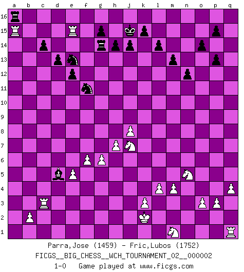 Last move : 1-0 2011 December 25 23:25:34 [Event "FICGS__BIG_CHESS__WCH_TOURNAMENT_02__000002"] [Site "FICGS"] [Date "2011.05.10"] [Round "1"] [White "Parra,Jose"] [Black "Fric,Lubos"] [Result "1-0"] [WhiteElo "1459"] [BlackElo "1752"] 1.j2-k4 j15-k13 2.h1-o7 h15-g13 3.e2-e4 m15-m13 4.f1-c4 e15-e13 5.d2-d4 p16-o14 6.p2-p3 d15-d13 7.o1-p2 c15-c14 8.m2-m4 n15-n13 9.c1-p13 o16-n15 10.b1-d2 q15-q14 11.p13-e3 f16-b12 12.l1-p5 k16-h15 13.p1-o3 b12-k4 14.j3-k4 c16-g12 15.k1-j3 g12-h13 16.o7-n6 n13-n12 17.f2-f4 e16-e14 18.h2-j4 l16-q11 19.j4-g5 e13-e12 20.g1-j2 e14-g14 21.n6-c16 h13-e10 22.l2-l4 e10-a14 23.k2-k3 g16-e15 24.c16-h16 j16-h16 25.k4-k5 b16-d15 26.p5-k10 d15-e13 27.j1-k2 e13-f11 28.d2-f3 e15-f13 29.g5-j6 g13-h11 30.k10-f6 h11-g9 31.f6-e7 f13-h12 32.j2-k4 h12-j10 33.f4-f5 k13-h12 34.o3-n5 q11-p12 35.f3-h4 p12-o11 36.g2-g4 h16-j15 37.g4-g5 o14-p12 38.h4-j2 n15-q12 39.h3-h4 p12-n11 40.e1-g1 h15-j13 41.g5-g6 n11-m9 42.j3-g4 l15-l14 43.h4-h5 j13-l12 44.h5-h6 q12-p13 45.j2-l3 m9-k8 46.h6-h7 k8-j6 47.k5-j6 g9-e8 48.e3-p13 q14-p13 49.e7-n15 o15-o14 50.n15-m16 a16-m16 51.m1-j1 l12-k10 52.q2-q4 e8-g7 53.g4-h6 j10-k8 54.j6-j7 k8-j6 55.k4-l6 j6-g5 56.g1-g5 g7-j6 57.g5-j5 j6-g7 58.a1-g1 g7-e8 59.e4-e5 q16-q10 60.j7-j8 k10-l8 61.l6-j7 l8-j7 62.j5-j7 m16-q16 63.c4-g8 a14-g8 64.h6-g8 e8-g7 65.f5-f6 g7-h5 66.j7-j5 h5-f4 67.g1-g3 f4-e2 68.g3-b3 e2-d4 69.b3-b15 d4-c2 70.b15-f15 q16-a16 71.j1-c1 q10-c10 72.j5-j2 c10-o10 73.j2-c2 f11-e13 74.f15-e15 h12-f11 75.q1-g1 o10-o2 76.p2-o3 o11-l8 77.g1-q1 l8-o5 78.l3-m1 o2-o3 79.n2-o3 o5-j10 80.g8-j7 j10-a2 81.c1-a1 a2-b3 82.c2-c3 b3-d5 83.a1-a15 1-0 Follow this game move after move (download)Life is a kind of Chess, with struggle, competition, good and ill events. (Benjamin Franklin) Schachspieler können ausgezeichnet Varianten am Schachbrett berechnen, aber nicht im realen Leben. Zu stark ist der Individualismus im Schach ausgeprägt, und für viele ist ein kleiner momentaner persönlicher Vorteil wichtiger als ein weit größerer Vorteil von morgen. (Anatoly Karpov) El Ajedrez era la lengua materna de Capablanca. (Reti) Donnez-moi un Cavalier en 6e et je gagnerais toutes mes parties. (Steinitz) Hold em is to stud what chess is to checkers. (Johnny Moss)