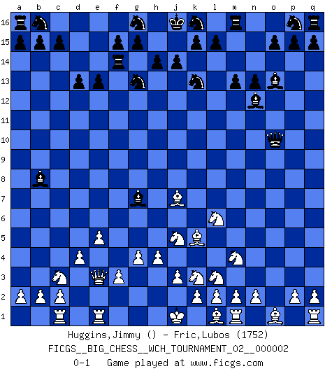 Last move : 0-1 2011 September 12 21:10:12 [Event "FICGS__BIG_CHESS__WCH_TOURNAMENT_02__000002"] [Site "FICGS"] [Date "2011.05.10"] [Round "1"] [White "Huggins,Jimmy"] [Black "Fric,Lubos"] [Result "0-1"] [WhiteElo ""] [BlackElo "1752"] 1.p1-o3 j15-k13 2.j2-k4 h16-o10 3.h3-h4 h15-g13 4.g1-h3 m15-m13 5.e2-e4 e15-e13 6.b1-c3 n15-n13 7.g2-g4 d15-d13 8.h3-j5 f16-b12 9.h2-k3 o16-f8 10.k4-l6 c16-n6 11.o3-m4 n6-q9 12.d2-d3 o10-o2 13.c1-j7 o2-o10 14.h1-f3 e16-e14 15.f1-k5 e14-f14 16.f3-e3 f8-d6 17.e4-e5 d6-b8 18.k1-l3 l16-p12 19.f2-f3 b12-g7 20.d3-d4 q9-n12 21.a1-c1 p12-o13 0-1 Follow this game move after move (download)When you play Bobby, it is not a question if you win or lose. It is a question if you survive. (Boris Spassky) Wenn Capablanka heute auf der Schachbühne erscheinen würde, hätte er ein halbes Jahr gebraucht um sich die Schachtheorie anzueignen. Und dann hätte er alles und jeden besiegt. (Mikhail Moiseyevich Botvinik) Hay dos clases de hombres: aquellos que se conforman en dejarse llevar por las circunstancias y que juegan barajas y aquellos decididos a controlar las circunstancias y que juegan al Ajedrez. (Mortimer Collins) Un footballeur joue avec ses pieds, parfois avec sa tête. Un joueur d'échecs ne joue qu'avec sa tête. Et quand il ne joue plus, il meurt. (Jacob Murray) A bird doesn't sing because it has an answer, it sings because it has a song. (Maya Angelou)
