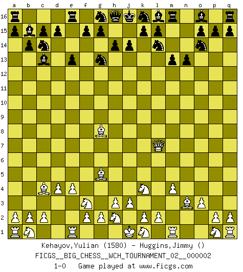 Last move : 1-0 2011 September 9 2:31:26 [Event "FICGS__BIG_CHESS__WCH_TOURNAMENT_02__000002"] [Site "FICGS"] [Date "2011.05.10"] [Round "1"] [White "Kehayov,Yulian"] [Black "Huggins,Jimmy"] [Result "1-0"] [WhiteElo "1580"] [BlackElo ""] 1.j2-k4 p16-o14 2.n2-n4 b15-b14 3.d2-d4 c16-b15 4.h1-l4 j15-l14 5.e2-e4 e15-e13 6.m2-m4 f16-c13 7.l1-n3 b15-n4 8.o2-o3 n4-b15 9.l4-l7 h15-g13 10.c1-g5 b16-c14 11.g1-f3 n15-n13 12.f1-c4 m15-m13 13.o1-g8 1-0 Follow this game move after move (download)When I asked Fischer why he had not played a certain move in our game, he replied: 'Well, you laughed when I wrote it down !' (Mikhail Tal) Wer sich die Fähigkeit anerziehen will im Schach selbstständig zu denken, der muß alles meiden, was leblos ist: ausgeklügelte Theorien, die sich auf sehr wenige Beispiele und eine Menge Hirngespinste stützen. (Emanuel Lasker) Un Peón pasado es un criminal, quién debe ser mantenido bajo candado y llave. Leves medidas, tales como vigilancia policiaca, no son suficientes. (Aaron Nimzovich) Nous sommes les pions de la mystérieuse partie d'Echecs jouée par Dieu. Il nous déplace, nous arrête, nous pousse encore, puis nous lance un à un dans la boîte du Néant. Epitaphe sur la tombe de David Janowsky (1868-1927). But they are useless. They can only give you answers. (Pablo Picasso, about computers)