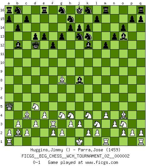 Last move : 0-1 2011 September 9 2:32:11 [Event "FICGS__BIG_CHESS__WCH_TOURNAMENT_02__000002"] [Site "FICGS"] [Date "2011.05.10"] [Round "1"] [White "Huggins,Jimmy"] [Black "Parra,Jose"] [Result "0-1"] [WhiteElo ""] [BlackElo "1459"] 1.p1-o3 m15-m13 2.b2-b3 l16-o13 3.e2-e4 n15-n13 4.c1-b2 o15-o14 5.j2-k4 g15-g13 6.f1-c4 h16-d12 7.g1-f3 b15-b14 8.h1-m5 d15-d13 9.b1-c3 c16-k9 10.d2-d3 k9-j8 11.m5-q5 j8-l10 12.q5-j5 e15-e13 13.m2-m4 p16-n15 14.k1-l3 f16-b12 15.j5-a5 k15-k14 16.l1-o4 n15-l14 17.n2-n3 j15-k13 18.o1-g8 m13-m12 19.h2-g4 l14-j13 20.f3-h4 f15-f13 21.e1-e3 l10-j8 22.e3-f3 f13-f12 23.c3-d5 o16-k12 0-1 Follow this game move after move (download)Even the laziest King flees wildly in the face of a double check ! (Aaron Nimzowitsch) Fischer machte Schach einfach zu einer aufregenden Sache, wann immer er sich ans Brett setzte. (Raymond Keene) El Ajedrez por encima de todo... ¡es una pelea!. (Emanuel Lasker) Soyez une menace à chaque fois que vous vous asseyez pour jouer. (Ken Smith) It is not enough to be a good player... you must also play well. (Siegbert Tarrasch)