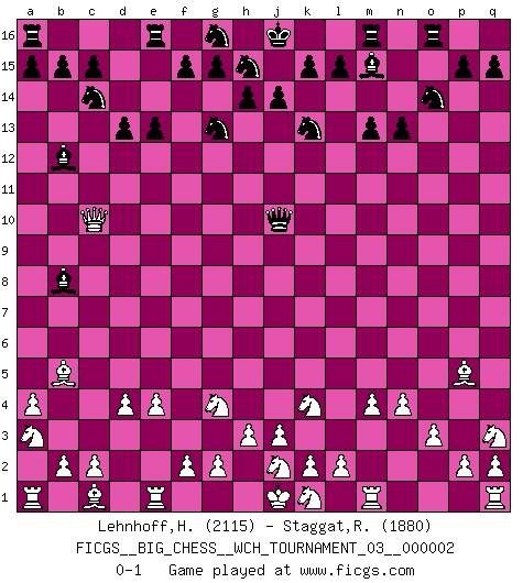 Last move : 0-1 2011 July 28 11:56:0 [Event "FICGS__BIG_CHESS__WCH_TOURNAMENT_03__000002"] [Site "FICGS"] [Date "2011.05.10"] [Round "1"] [White "Lehnhoff,Heinz-Georg"] [Black "Staggat,Rolf"] [Result "0-1"] [WhiteElo "2115"] [BlackElo "1880"] 1.j2-k4 j15-k13 2.h1-o7 h15-g13 3.o7-o15 p16-o14 4.o15-f7 b16-c14 5.e2-e4 m15-m13 6.d2-d4 n15-n13 7.m2-m4 e15-e13 8.h2-g4 d15-d13 9.f1-b5 l16-m15 10.n2-n4 f16-b12 11.g1-j2 o16-f8 12.p1-q3 q16-o16 13.o2-o3 h16-o10 14.a2-a4 c16-h11 15.b1-a3 h11-j10 16.f7-c10 k16-h15 17.o1-g8 f8-d10 18.g8-j10 o10-j10 19.l1-p5 d10-b8 0-1 Follow this game move after move (download)Help your pieces so they can help you. (Paul Morphy) Das Schach hält seine Meister in eigenen Banden, Fesseln; auf vielerlei Weise formt es ihren Geist, so dass die innere Freiheit selbst des Stärksten beeinflusst wird. (Albert Einstein) Aquel que ve no otra dirección en el juego que la de dar Jaque Mate a su oponente, nunca será un buen jugador de Ajedrez. (Euwe) Horreur, mais aussi harmonie suprême : qu'y avait-il en effet au monde en dehors des échecs ? Le brouillard, l'inconnu, le non-être... (Vladimir Nabokov) The human is the only animal species whose members are able to talk themselves into difficulties that would not otherwise exist. (Wendell Johnson)