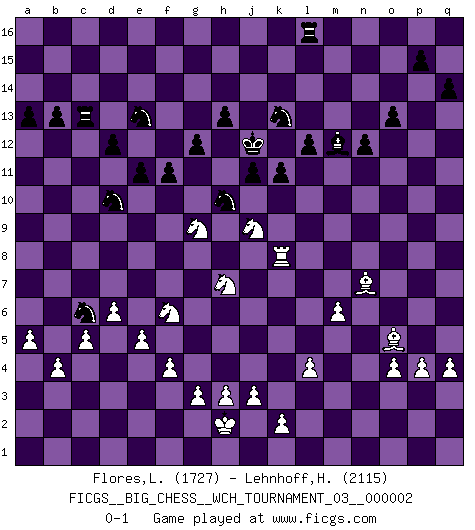 Last move : 0-1 2012 April 6 13:54:49 [Event "FICGS__BIG_CHESS__WCH_TOURNAMENT_03__000002"] [Site "FICGS"] [Date "2011.05.10"] [Round "1"] [White "Flores,Luis"] [Black "Lehnhoff,Heinz-Georg"] [Result "0-1"] [WhiteElo "1727"] [BlackElo "2115"] 1.j2-k4 g15-g14 2.b1-c3 h16-d12 3.m2-m4 e15-e13 4.g1-f3 f16-b12 5.k1-l3 m15-m13 6.n2-n4 n15-n13 7.e2-e4 d15-d13 8.d2-d4 j15-k13 9.p1-o3 p16-q14 10.l1-n3 l16-p12 11.h1-p8 c16-l8 12.m4-m5 d12-j12 13.f1-b5 j12-j13 14.j1-h1 o15-o14 15.o1-f9 g16-j15 16.f9-h11 l8-n10 17.p8-b8 a15-a13 18.h11-f9 h15-g13 19.c1-j7 o16-f8 20.j7-f10 j13-p7 21.n3-p5 k16-h15 22.b8-c7 p7-c7 23.f10-c7 b16-a14 24.a1-d1 m13-m12 25.h2-g4 e13-e12 26.m1-m4 f8-g9 27.m4-m2 g13-f11 28.c7-g11 j15-h13 29.g11-o4 k13-l11 30.o4-n3 g9-f8 31.n3-e11 h15-g13 32.p5-n3 d13-d12 33.e11-f10 j14-j13 34.m5-m6 e12-e11 35.f10-j7 f11-h10 36.f9-e8 l11-k9 37.j7-g9 g13-f11 38.g9-f8 b12-f8 39.m2-m5 n10-p8 40.q1-m1 p12-k7 41.h1-h2 p8-m5 42.k4-m5 a14-b12 43.e8-g10 k7-g10 44.b5-g10 h13-j11 45.g10-e8 b12-d11 46.e8-b11 e16-e15 47.n3-p5 d11-c9 48.b11-g6 g14-g13 49.n4-n5 j16-j15 50.m1-m4 k9-h8 51.g6-n12 j11-g10 52.m4-l4 l15-l14 53.e4-e5 o14-o13 54.n12-l10 c9-d11 55.g4-f6 d11-f12 56.e1-e4 q16-o16 57.d4-d5 m12-m11 58.l10-p6 q14-p12 59.l4-q4 q15-q14 60.q4-q8 h8-k9 61.d5-d6 f8-j5 62.g2-g3 j5-o10 63.q8-b8 b15-b14 64.e4-c4 j15-j14 65.d1-d4 f12-d13 66.p6-n4 g10-f12 67.m5-n7 a16-d16 68.f3-g5 c15-c13 69.n7-m9 o10-m12 70.g5-h7 d13-b12 71.d4-e4 f11-h12 72.m9-k8 k15-k13 73.c3-d5 l14-l13 74.d5-e7 n13-n12 75.e7-d9 f12-g14 76.d9-b10 g14-e13 77.b10-a12 d16-d14 78.l3-j4 f15-f13 79.j4-g5 p12-n11 80.g5-e6 h10-f11 81.e6-d8 f11-d10 82.d8-e10 f13-f12 83.k8-h9 n11-l10 84.n4-o5 k9-h10 85.o3-m4 m16-m14 86.p2-p3 m14-p14 87.q2-q4 p14-p9 88.h7-f8 h10-f11 89.m4-l6 h14-h13 90.e4-j4 p9-j9 91.j4-k4 k13-k12 92.l6-j7 j13-j12 93.j7-l8 j9-j5 94.f2-f4 j5-n5 95.p3-p4 j14-j13 96.o2-o4 n5-l5 97.h9-j7 l10-j9 98.f8-h7 j9-l8 99.j7-l8 l5-l6 100.a2-a4 o16-l16 101.a4-a5 l13-l12 102.e10-f8 j12-j11 103.f8-h9 h12-k13 104.h9-j7 l6-l5 105.l2-l4 m11-m10 106.l8-m10 l5-l10 107.m10-l8 l10-q10 108.j7-l6 g13-g12 109.b2-b3 d10-c12 110.b3-b4 e15-c15 111.l6-k8 b14-b13 112.p5-n7 q10-a10 113.a12-c13 c15-c13 114.l8-j9 a10-c10 115.c4-c10 b12-c10 116.b8-c8 c12-d10 117.c8-c5 f11-h10 118.k8-j10 k12-k11 119.j10-g9 f12-f11 120.c2-c4 j13-j12 121.c5-c7 d14-c14 122.c4-c5 c10-d8 123.c7-c13 c14-c13 124.k4-k8 d8-c6 0-1 Follow this game move after move (download)My style is somewhere between that of Tal and Petrosian. (Reshevsky) Ein Großmeister muß tausende Partien in seinem Kopf speichern, denn diese sind für Ihn, was die Worte der Muttersprache für gewöhnliche Leute sind, oder Noten für Musiker... (Garry Kasparov) Las combinaciones han sido siempre el aspecto más intrigante del Ajedrez. Los Maestros las buscan, el público las aplauden, los críticos las alaban. La razón se debe a que las combinaciones hacen posible que el Ajedrez sea más que un ejercicio matemático con una carencia de vida. Ellas son la poesía del juego, son del Ajedrez lo que la melodía es de la música. Ellas representan el triunfo de la mente sobre la materia. (Reuben Fine) Fischer est le meilleur joueur du monde et Karpov n'est qu'un joueur de bistrot. (Garry Kasparov, agé de 16 ans) A journey of a thousand sites begins with a single click. (Author unknown)