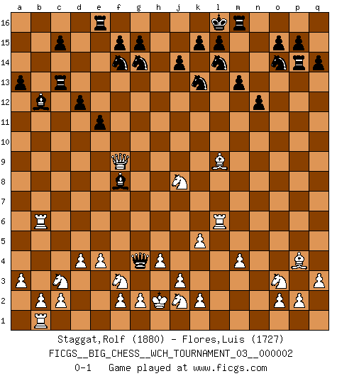 Last move : 0-1 2011 November 10 11:41:7 [Event "FICGS__BIG_CHESS__WCH_TOURNAMENT_03__000002"] [Site "FICGS"] [Date "2011.05.10"] [Round "1"] [White "Staggat,Rolf"] [Black "Flores,Luis"] [Result "0-1"] [WhiteElo "1880"] [BlackElo "1727"] 1.j2-k4 j15-k13 2.p1-o3 p16-o14 3.e2-e4 k16-l14 4.d2-d4 m15-m13 5.m2-m4 n15-n13 6.n2-n4 e15-e13 7.b1-c3 h15-g13 8.l1-p5 g16-f14 9.c1-l9 d15-d13 10.f1-b5 b16-c14 11.o1-f9 c16-k9 12.h1-l4 l16-o13 13.l4-j6 j16-k16 14.e1-e3 f16-b12 15.g1-j2 o16-f8 16.e3-g3 f8-j5 17.h3-h4 j5-g7 18.h2-f3 h16-l13 19.m1-m3 l13-b4 20.a1-b1 a16-d16 21.k4-h5 g7-d10 22.a2-a3 b4-a5 23.k1-h2 a5-a7 24.m3-k3 k9-m11 25.q1-m1 a7-q7 26.j6-k7 q7-p6 27.h5-k6 e13-e12 28.f9-h7 o13-p12 29.k7-m7 m11-h7 30.m7-h7 p6-n4 31.h7-l4 n4-p4 32.l4-o1 d13-d12 33.q2-q3 p4-o5 34.o1-n2 e12-e11 35.b5-g10 q16-n16 36.g10-n4 o5-f13 37.k3-k5 p12-j6 38.l2-l4 j6-k5 39.l4-k5 n13-n12 40.n4-l6 d10-h6 41.l9-m8 n16-n13 42.m1-l1 n13-p13 43.l6-m7 f13-b9 44.n2-n6 d16-d13 45.k6-j8 h6-f8 46.g3-g5 d13-c13 47.g5-b5 b9-f9 48.b5-f5 f9-g8 49.l1-l8 g8-g10 50.f5-g5 g10-c10 51.h2-g4 f8-e7 52.g5-g6 c10-b9 53.f3-d2 e16-e12 54.n6-n11 b9-p9 55.n11-k8 c14-e13 56.k8-f4 q15-q14 57.m8-g13 h14-g13 58.p5-g13 k16-l16 59.f4-f13 e13-g14 60.f13-c16 e12-e16 61.c16-b15 a15-a13 62.g13-l9 p13-p14 63.m7-p4 p9-m12 64.d2-f3 m12-m9 65.l8-l6 m9-h13 66.b15-g10 e7-f8 67.j1-h2 h13-b7 68.g6-b6 b7-c8 69.g10-f9 c8-g4 0-1 Follow this game move after move (download)There must have been a time when men were demigods, or they could not have invented Chess. (Gustav Schenk) Jeder leidlich begabte Spieler, er braucht keineswegs hervorragend veranlagt zu sein, kann es zum Meister bringen. Aber das ist ja auch gar nicht nötig! Der richtige Standpunkt ist es, zu seinem Vergnügen zu spielen, und man glaube ja nicht, dass der Genuss proportional dem Können sei. (Siegbert Tarrasch) Alekhine es un poeta que crea un trabajo de arte de algo que raramente inspiraría a otra persona a mandar una tarjeta postal. (Max Euwe) Le moment que je préfère le plus dans une rencontre, c'est celui où je sens que la personnalité de l'adversaire se brise. (Robert Fischer) The only difference between a tax man and a taxidermist is that the taxidermist leaves the skin. (Mark Twain)
