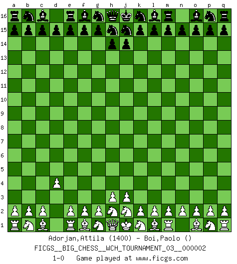 Last move : 1-0 2011 July 3 8:11:51 [Event "FICGS__BIG_CHESS__WCH_TOURNAMENT_03__000002"] [Site "FICGS"] [Date "2011.06.01"] [Round "1"] [White "Adorjan,Attila"] [Black "Boi,Paolo"] [Result "1-0"] [WhiteElo "1400"] [BlackElo ""] 1.d2-d4 1-0 This big chess game has been lost on time (started : 2011.06.01 1:21:58) Follow this game move after move (download)Bobby just drops the pieces and they fall on the right squares. (Miguel Najdorf) Ich bewundere Kasparows phantasievolle Angriffssiege aus den Achtzigern und Neunzigern, aber wenn man sie mit dem Computer überprüft, nimmt der Computer in jeder zweiten Partie die Opfer an, verteidigt sich und gewinnt. (Vladimir Kramnik) Un entendimiento a fondo de las continuaciones típicas del mate, hace de las combinaciones de sacrificio mas complicadas conducirlas a ellas no solo sin dificultad, sino casi de una manera natural. (Siegbert Tarrasch) Je ne suis pas le dernier à jouer lâchement des coups douteux pendant le zeïtnot de l'adversaire pour l'achever: en effet les coups qui font le plus peur sont ceux que l'on ne comprend pas. Je me fais souvent peur quand je joue. (Un professeur anonyme) Every man's memory is his private literature. (Aldous Huxley)