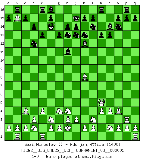 Last move : 1-0 2011 July 11 20:16:37 [Event "FICGS__BIG_CHESS__WCH_TOURNAMENT_03__000002"] [Site "FICGS"] [Date "2011.05.10"] [Round "1"] [White "Gazi,Miroslav"] [Black "Adorjan,Attila"] [Result "1-0"] [WhiteElo ""] [BlackElo "1400"] 1.k1-l3 n15-n13 2.m2-m4 m15-m13 3.l1-o4 d15-d14 4.n2-n4 k16-l14 5.e2-e4 p16-o14 6.f1-c4 g15-g13 7.o1-g8 l16-n14 8.d2-d3 h16-f14 9.h2-g4 b16-c14 10.c1-k8 e15-e13 11.j2-h4 h15-j13 12.b1-d2 j15-k13 13.p1-n2 g16-j15 14.h1-m5 c16-h11 15.g1-f3 o16-k12 16.m1-m3 j15-h13 17.m3-p3 q16-p16 18.j1-h2 j16-j15 19.g8-h9 c14-d12 20.h9-b15 a16-b16 21.a1-b1 1-0 This big chess game has been lost on time (started : 2011.05.10 11:28:12) Follow this game move after move (download)I have added these principles to the law: get the Knights into action before both Bishops are developed. (Emanuel Lasker) Schach ist ein Reich, wo sich die menschliche Phantasie frei entfalten kann. (David Bronstein) El Ajedrez, como la música, como el amor, tiene el poder de hacer feliz a la gente. (Siegbert Tarrasch) Aux échecs, l'amour-propre est satisfait quand on remporte la victoire, mais il n'y a pas de honte à être battu. (Benjamin Franklin) The age of a woman doesn't mean a thing. The best tunes are played on the oldest fiddles. (Ralph Waldo Emerson)