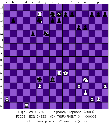 Last move : 0-1 2011 June 25 19:46:1 [Event "FICGS__BIG_CHESS__WCH_TOURNAMENT_04__000002"] [Site "FICGS"] [Date "2011.06.01"] [Round "1"] [White "Kuge,Tom"] [Black "Legrand,Stephane"] [Result "0-1"] [WhiteElo "1730"] [BlackElo "2083"] 1.d2-d4 m15-m13 2.g2-g3 b16-c14 3.h3-h4 e15-e13 4.h1-a8 f16-c13 5.m2-m4 p16-o14 6.l1-p5 l16-o13 7.n2-n3 d15-d14 8.e2-e4 j15-k13 9.f1-l6 g16-f14 10.c1-l9 e13-e12 11.g1-h3 c16-k9 12.b1-c3 n15-n13 13.p1-o3 o16-l13 14.l9-k8 l13-m12 15.a1-d1 h16-l13 16.j2-k4 k16-l14 17.h3-g5 o14-p12 18.o1-c12 c14-e13 19.c12-j6 p12-n11 20.k1-l3 m16-m14 21.c3-d5 m14-p14 22.q2-q4 c13-h8 23.h2-f3 p14-p8 24.k8-n5 o13-m11 25.a8-c10 h8-b14 26.e1-e3 n11-l10 27.l6-j4 l10-k8 28.j6-k7 k8-m7 29.n5-m6 m7-n9 30.k7-m5 p8-p6 31.m6-l5 n9-m7 32.l5-b14 c15-b14 33.c10-d10 p6-d6 34.d10-a10 m7-k6 35.j4-a12 e16-c16 36.m5-h9 c16-c2 37.k4-h3 m12-g7 38.l3-j2 k9-g6 39.d1-d2 c2-d2 40.f3-d2 g7-d4 41.e3-b3 j16-j15 42.f2-f4 q16-c16 43.j2-k4 c16-c1 44.j1-h2 c1-c2 45.b3-d3 d4-b2 46.a12-g6 m11-g6 47.a10-a4 a16-c16 48.m1-d1 l13-l8 49.d5-b4 l8-e2 50.h3-f2 e2-f2 51.h2-h3 c16-c3 52.q1-f1 f2-k2 53.d3-d6 k6-l4 54.f1-j1 k2-e2 55.g5-j4 c3-g3 56.h3-g3 g6-j4 57.j1-g1 c2-c9 58.h9-g8 c9-g9 59.a4-b3 l4-k2 60.d2-f3 k2-h1 61.g3-g4 h1-f2 62.g4-g5 b2-c3 63.g5-h6 e2-f3 64.b4-d5 f2-e4 65.g8-j6 g9-h9 66.h6-j7 f3-j3 67.d5-c3 j3-h4 68.b3-h9 h4-h9 69.c3-e4 h9-e9 70.e4-g5 e9-g7 71.j7-k6 g7-k4 72.k6-j7 j4-l2 73.g5-h3 k4-k9 74.o3-n5 k13-j11 75.g1-g15 l14-j13 76.d6-d14 e13-g12 77.g15-f15 l2-c10 78.f15-b15 k9-j9 79.j7-k6 j9-h8 80.k6-j5 h8-h3 81.b15-a15 j11-k9 82.p5-f14 h3-f5 83.j5-k6 g12-f14 84.a15-f15 j13-g12 85.d14-c14 c10-a12 86.c14-c4 k9-h8 87.c4-c6 h8-j6 88.c6-j6 a12-h5 0-1 Follow this game move after move (download)Excellence at Chess is one mark of a scheming mind. (Sir Arthur Conan Doyle) Ich würde mich als ganz normalen Jungen bezeichnen [Im Alter von 12]. (Sergej Karjakin) El Ajedrez es un regaderazo frío para la mente. (Sir John Simon) L'attaque fait le spectacle, la défense gagne les matchs. (Dicton footballistique) Fortune favours the audacious. (Desiderius Erasmus)