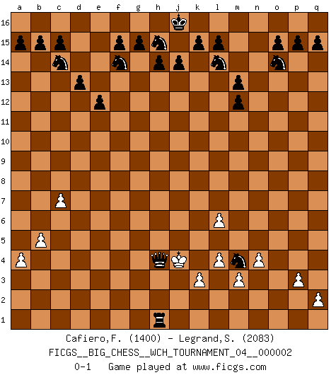 Last move : 0-1 2011 May 24 23:10:8 [Event "FICGS__BIG_CHESS__WCH_TOURNAMENT_04__000002"] [Site "FICGS"] [Date "2011.05.10"] [Round "1"] [White "Cafiero,Florian"] [Black "Legrand,Stephane"] [Result "0-1"] [WhiteElo "1400"] [BlackElo "2083"] 1.h3-h4 m15-m13 2.j2-k4 p16-o14 3.g2-g4 e15-e13 4.n2-n4 b16-c14 5.d2-d4 j15-k13 6.o1-k5 d15-d13 7.h1-m5 e13-e12 8.m2-m3 f16-d14 9.l1-p5 n15-n13 10.c1-l9 c16-k9 11.e2-e4 l16-o13 12.f2-f3 o16-l13 13.k5-m7 l13-m12 14.l9-k10 k16-l14 15.m7-k9 o13-k9 16.k10-m12 n13-m12 17.f1-m7 k9-m7 18.m5-m7 g16-f14 19.b1-d2 h16-k14 20.p1-o3 q16-n16 21.l2-l4 k14-g11 22.c2-c4 n16-n11 23.d4-d5 m16-n16 24.h2-j4 g11-f10 25.p5-n3 f10-f4 26.j1-h1 f4-d2 27.e1-e2 d2-d4 28.a1-c1 n11-a11 29.a2-a3 n16-n11 30.n3-j7 n11-b11 31.m7-q11 b11-q11 32.j7-e3 d4-j9 33.k1-h2 q11-b11 34.c1-c2 b11-b3 35.f3-f4 a11-b11 36.e4-e5 j9-k9 37.f4-f5 d14-b12 38.h2-f3 k9-g9 39.f3-d4 b3-b7 40.g4-g5 g9-j9 41.j4-h6 j9-e5 42.d4-e6 b12-h6 43.e3-b6 e5-f5 44.c4-c5 h6-k4 45.j3-k4 f5-d5 46.h1-j2 b7-e7 47.e6-f4 d5-f5 48.g1-h3 e7-e2 49.c2-e2 b11-h11 50.m1-d1 h11-h4 51.j2-j3 f5-g4 52.k2-k3 h4-h3 53.f4-h3 g4-e2 54.q1-f1 e16-e13 55.d1-e1 e2-o2 56.f1-f2 o2-h8 57.e1-e4 e13-h13 58.h3-j5 a16-e16 59.b6-g11 h8-h1 60.e4-f4 h1-j1 61.f2-j2 j1-f4 62.j3-k2 h13-h1 63.o3-m2 f4-g5 64.k2-l3 g5-g11 65.j2-l2 k13-l11 66.b2-b4 l11-k9 67.p2-p3 k9-m8 68.a3-a4 m8-n6 69.j5-l6 e16-e13 70.b4-b5 e13-l13 71.k4-k5 l13-l6 72.k5-l6 g11-n5 73.l3-k4 h1-h4 74.k4-j3 n5-j5 75.j3-k2 h4-h2 76.k2-l1 h2-h1 77.m2-k1 j5-n1 78.l1-k2 n1-k1 79.k2-l3 k1-n1 80.l2-m2 h1-l1 81.l3-k4 n1-m2 82.k4-j3 l1-h1 83.c5-c6 n6-m4 84.c6-c7 m2-h2 85.j3-j4 h2-h4 0-1 Follow this game move after move (download)The blunders are all there on the board, waiting to be made. (Savielly Tartakover) Matt entspricht nicht immer den Tatsachen. (Savielly Grigorievitsch Tartakower) Una victoria por una combinación errónea, aunque sea espectacular, me llena de horror artístico. (Wilhelm Steinitz) Dieu déplace le joueur, et celui-ci la pièce. Quel Dieu derrière Dieu commence donc la trame ? Arturo Perez-Reverte (prix de littérature policière 1993). Faith : not wanting to know what is true. (Friedrich Nietzsche)