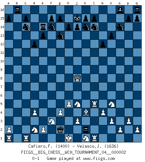 Last move : 0-1 2011 July 28 11:7:1 [Event "FICGS__BIG_CHESS__WCH_TOURNAMENT_04__000002"] [Site "FICGS"] [Date "2011.06.01"] [Round "1"] [White "Cafiero,Florian"] [Black "Velasco,Jose Maria"] [Result "0-1"] [WhiteElo "1400"] [BlackElo "1636"] 1.g2-g4 d15-d13 2.h1-e4 e15-e13 3.e4-c4 b16-c14 4.c4-o15 p16-o14 5.o15-d5 g16-f14 6.n2-n3 m15-m13 7.h3-h4 j15-h13 8.h2-f3 n15-n13 9.d2-d3 l16-p12 10.h4-h5 h16-o10 11.d5-d4 m13-m12 12.p1-o3 f16-a11 13.c1-g5 a11-b12 14.m2-m4 b12-f8 15.l1-m2 f8-c5 16.g5-h4 o10-l10 17.d4-j9 l10-l2 18.o1-b13 l2-p6 19.p2-p3 p12-k7 20.j9-o4 p6-b6 21.d3-d4 c5-d6 22.h4-g3 d6-g3 23.j2-g3 b6-b13 24.q1-n1 b13-b2 25.b1-d2 b2-c2 26.e1-c1 c2-j8 27.o3-n5 o16-d6 28.m1-l1 k16-l14 29.o4-o7 c16-h11 30.o7-p6 d6-o16 31.p6-b6 h13-k14 32.b6-b15 d13-d12 33.b15-b1 j8-k8 34.f1-l6 h11-g10 35.l6-k7 k8-k7 36.l1-l4 m16-m13 37.g1-h3 a16-b16 38.b1-g6 h15-g13 39.l4-l10 g10-j8 40.g6-c10 j16-j15 41.l10-l5 m13-k13 42.n1-l1 e16-e14 43.h3-j5 k7-k2 44.j1-h1 k2-f2 45.c10-e8 f2-g3 46.e8-j8 k13-k2 47.m2-k4 g3-g2 0-1 Follow this game move after move (download)You know you're going to lose. Even when I was ahead I knew I was going to lose. - On playing against Fischer. (Andrew Soltis) Ich bin es gewohnt, das die Jugend mir überhaupt keinen Respekt entgegenbringt. (Alexander Morozewich) Una victoria por una combinación errónea, aunque sea espectacular, me llena de horror artístico. (Wilhelm Steinitz) Aux échecs, l'amour-propre est satisfait quand on remporte la victoire, mais il n'y a pas de honte à être battu. (Benjamin Franklin) Animated gif is worth one mega-word. (Unknown)