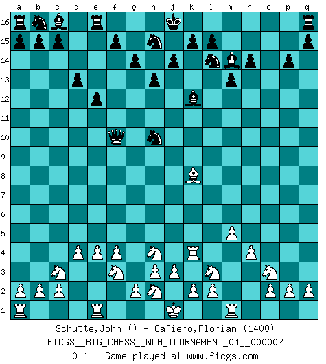 Last move : 0-1 2011 June 6 7:31:21 [Event "FICGS__BIG_CHESS__WCH_TOURNAMENT_04__000002"] [Site "FICGS"] [Date "2011.05.10"] [Round "1"] [White "Schutte,John"] [Black "Cafiero,Florian"] [Result "0-1"] [WhiteElo ""] [BlackElo "1400"] 1.e2-e4 j15-k13 2.j2-h4 d15-d13 3.h1-o7 g15-g14 4.o7-o15 h16-c11 5.b1-c3 n15-n14 6.m2-m4 p16-o14 7.l1-m2 c11-c14 8.m2-g7 k13-m14 9.g7-o14 m14-o15 10.o14-m16 o15-m16 11.k1-l3 h14-h13 12.n2-n4 m15-m13 13.f1-b5 l16-m15 14.o1-f9 m15-f9 15.b5-f9 m16-l14 16.p1-o3 g16-f14 17.d2-d4 f16-k12 18.c1-o12 o16-m14 19.o12-k8 e15-e13 20.f2-f4 p15-p14 21.g1-f3 f14-g12 22.m4-m5 g12-h10 23.f9-g10 e13-e12 24.m1-m4 c14-c8 25.m4-k4 c8-f8 26.q1-m1 f8-f10 27.g10-l14 k16-l14 0-1 Follow this game move after move (download)The isolated Pawn casts gloom over the entire chessboard. (Aaron Nimzovich) Du kannst im Schach nur gut werden, wenn du das Spiel liebst. (Robert James Fischer) No hay otro maestro que tenga una voluntad terrífica de ganar. Al tablero, el irradía peligro y aún los oponentes mas fuertes tienden a congelarse como liebres cuando olfatean a una pantera. Aún sus debilidades son peligrosas. Con las blancas, su juego de apertura es predecible - te es posible hacer planes en su contra - pero es tan fuerte que tus planes casi nunca funcionan. En el juego medio, su precisión e invención son fabulosas y en finales, tú simplemente no le puedes vencer. (Experto Alemán anónimo) Le plus grand jeu de l'esprit jamais inventé, plus vous l'apprenez, plus vous y prenez du plaisir. (Garry Kasparov) Rules and bones are meant to be broken. (Anonymous)