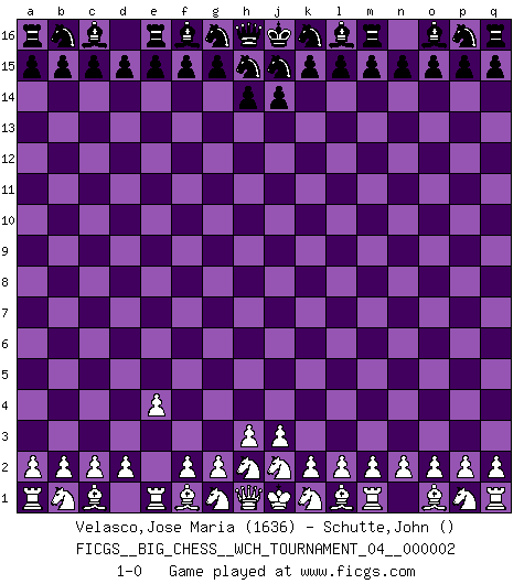 Last move : 1-0 2011 June 6 7:31:36 [Event "FICGS__BIG_CHESS__WCH_TOURNAMENT_04__000002"] [Site "FICGS"] [Date "2011.06.01"] [Round "1"] [White "Velasco,Jose Maria"] [Black "Schutte,John"] [Result "1-0"] [WhiteElo "1636"] [BlackElo ""] 1.e2-e4 1-0 Follow this game move after move (download)In the perfect Chess combination as in a first-rate short story, the whole plot and counter-plot should lead up to a striking finale, the interest not being allayed until the very last moment. (Yates and Winter) Ich verstehe den Grund nicht, warum die Aufteilung in Frauen und Männer überhaupt im Schach besteht. (Judith Polgar) Los tropiezos estan todos ahí en el tablero, esperando que se cometan. (Savielly Tartakover) Nous vivons dans un monde échiquéen : chaque jour qui passe est un défi à relever. (Philosophe Sasha) That's absurd. I love it. (Gregory House, House M.D.)