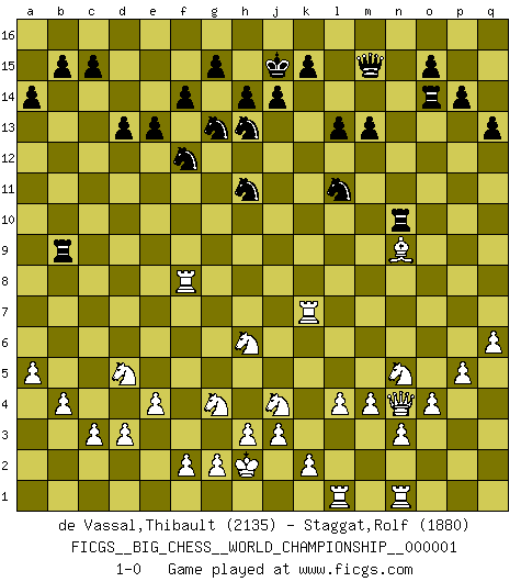 Last move : 1-0 2011 December 16 20:37:46 [Event "FICGS__BIG_CHESS__WORLD_CHAMPIONSHIP__000001"] [Site "FICGS"] [Date "2011.05.10"] [Round "1"] [White "de Vassal,Thibault"] [Black "Staggat,Rolf"] [Result "1-0"] [WhiteElo "2135"] [BlackElo "1880"] 1.j2-k4 p16-o14 2.h1-l4 j15-k13 3.l4-c12 h15-g13 4.m2-m4 b16-c14 5.p1-o3 e15-e13 6.l1-p5 k16-h15 7.e2-e4 g16-f14 8.h2-g4 d15-d13 9.c12-j6 m15-m13 10.f1-b5 l16-p12 11.j6-j5 f16-b12 12.j5-j4 c16-h11 13.b5-c4 n15-n13 14.b1-c3 h16-k14 15.n2-n3 k14-j13 16.j4-h4 o16-f8 17.g1-j2 p12-l8 18.d2-d3 l8-j10 19.c4-j10 j13-j10 20.h4-p11 q16-p16 21.p11-n13 m16-n16 22.n13-h8 n16-n9 23.k1-h2 j16-j15 24.h2-j4 e16-n16 25.c1-h6 f8-g9 26.h8-h7 b12-h6 27.j4-h6 g9-j11 28.p5-o4 j10-h9 29.h7-a7 f14-h13 30.j2-g3 h15-j13 31.a7-e3 a16-e16 32.a1-d1 e16-e14 33.c3-d5 e14-f14 34.b2-b4 h9-a9 35.c2-c3 o14-n12 36.d1-a1 n12-l11 37.a2-a4 c14-e15 38.o4-l7 n9-n12 39.o3-n5 l11-m9 40.l7-h4 k13-l11 41.o1-n2 n16-n14 42.o2-o4 p16-n16 43.p2-p4 e15-g14 44.q2-q4 a15-a14 45.q4-q5 q15-q13 46.p4-p5 h11-g10 47.q1-p1 m9-n7 48.n2-p4 g10-e12 49.j1-h2 a9-o9 50.l2-l4 n7-o5 51.p1-n1 o5-m6 52.m1-l1 e12-n4 53.g3-j4 n4-o5 54.p4-o5 m6-o5 55.e3-b6 f14-b14 56.b6-f6 o9-q11 57.q5-q6 b14-f14 58.f6-b10 f14-b14 59.b10-o10 l15-l13 60.o10-o5 g13-e14 61.e1-e3 n14-o14 62.o5-n4 g14-f12 63.e3-f3 j13-h11 64.n4-l6 q11-o11 65.l6-k7 o11-q11 66.f3-f5 n12-k12 67.k7-h9 k12-k9 68.h9-n4 b14-b9 69.a1-e1 f15-f14 70.e1-e3 n16-n10 71.e3-f3 q11-m15 72.a4-a5 m15-k13 73.k4-l6 e14-g13 74.l6-m8 j11-m8 75.h4-m8 b9-b8 76.m8-h4 p15-p14 77.f5-f8 b8-b9 78.f3-f7 k13-m15 79.f7-k7 k9-n9 80.h4-n9 1-0 Follow this game move after move (download)A good player is always lucky. (Jose Raul Capablanca) Über Karpov: Er war und ist ein Vertreter der russischen Reaktionäre. Das steckt tief in seiner Seele, wehalb ich nicht nett mit ihm umgehen kann. (Viktor Kortschnoi) ¿Se han dado cuenta de que Fischer casi nunca ha tenido piezas malas? El las intercambia y las piezas malas se quedan con sus oponenets. (Yuri Balashov) Pour moi, les échecs ne sont pas un jeu mais un art. (Alexandre Alekhine) When you have everything, sometimes it feels like nothing. (Horatio Caine, C.S.I. Miami)