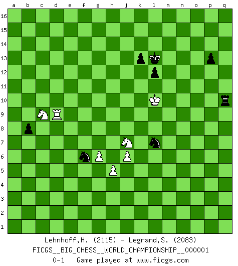 Last move : 0-1 2013 February 20 17:9:39 [Event "FICGS__BIG_CHESS__WORLD_CHAMPIONSHIP__000001"] [Site "FICGS"] [Date "2011.05.10"] [Round "1"] [White "Lehnhoff,Heinz-Georg"] [Black "Legrand,Stephane"] [Result "0-1"] [WhiteElo "2115"] [BlackElo "2083"] 1.j2-k4 p16-o14 2.m2-m4 m15-m13 3.h1-o7 h15-g13 4.l1-p5 e15-e13 5.d2-d4 j15-h13 6.e2-e4 b16-c14 7.n2-n4 f16-b12 8.g1-j2 d15-d13 9.c1-l9 k16-l14 10.b1-a3 l16-p12 11.f1-b5 h16-l13 12.p1-q3 l13-b4 13.o1-f9 g16-j15 14.a3-c4 c16-j10 15.d4-d5 n15-n14 16.c2-c3 b4-f8 17.h2-g4 e13-e12 18.k1-h2 e12-e11 19.a2-a4 e11-e10 20.f9-e8 p12-l8 21.m4-m5 e16-e11 22.c4-e3 a16-e16 23.e3-f5 e11-o11 24.o7-c7 e10-e9 25.o2-o3 g13-e12 26.l9-h6 f8-g9 27.p5-l9 j10-f13 28.q3-p5 e12-d10 29.e8-c10 j16-k16 30.c10-f13 l8-f13 31.c7-k7 o11-d11 32.h6-j7 g9-g12 33.p5-n6 f13-e12 34.k7-k5 o16-j11 35.l9-k8 h13-g11 36.j7-h6 d10-f11 37.j2-l3 a15-a14 38.j1-j2 d11-d10 39.k5-g5 j11-h10 40.e1-e3 b12-d14 41.e3-g3 g12-h12 42.k8-l9 h12-l12 43.f5-g7 f11-g9 44.h6-j7 g11-j10 45.l9-m8 h10-l13 46.g4-j5 j15-h13 47.j5-l6 l14-j13 48.h2-f3 e16-e14 49.g5-e5 d10-d11 50.f3-d4 l13-m12 51.e5-b8 c14-b12 52.d4-e6 o14-n12 53.l3-j4 a14-a13 54.m1-m3 l12-m11 55.f2-f3 n12-l11 56.j7-e3 l11-k9 57.m8-h4 k9-h8 58.e3-d4 k16-j15 59.m3-l3 j13-l12 60.a1-m1 h8-k7 61.g7-f5 k7-m6 62.d4-m12 m11-m12 63.l6-m4 d14-j9 64.b8-o8 m12-o14 65.o8-p9 h13-k14 66.f5-d4 j9-h10 67.g3-g6 o14-p14 68.p9-p14 q15-p14 69.h4-l7 h10-l7 70.l3-l7 m6-k7 71.l7-o7 o15-o14 72.q2-q3 q16-q9 73.m4-o5 m16-q16 74.q3-q4 e14-g14 75.p2-p4 g9-f7 76.g6-g14 f15-g14 77.d4-f5 f7-e5 78.f3-f4 e5-g6 79.g2-g4 g6-f8 80.e6-f8 e9-f8 81.c3-c4 j10-h8 82.e4-e5 q9-l9 83.l2-l3 d11-g11 84.o7-o8 l12-m10 85.o5-m4 m10-k9 86.m4-l6 q16-q11 87.q4-q5 g11-o11 88.o8-o11 q11-o11 89.n6-m4 b12-d11 90.m4-o5 d11-f10 91.k2-k3 f10-d9 92.d5-d6 o11-c11 93.b2-b4 d9-b8 94.f5-d4 h8-g6 95.k4-h5 k9-h8 96.c4-c5 l9-a9 97.m1-e1 e12-g10 98.e1-a1 c11-a11 99.c5-c6 a9-a10 100.q1-e1 h8-f7 101.d6-d7 b8-a6 102.d4-c2 f7-d8 103.b5-d3 k7-h8 104.d3-e4 p14-p13 105.a1-b1 a10-b10 106.j4-g5 a11-b11 107.e1-e3 g6-e7 108.e3-c3 b11-c11 109.b4-b5 a6-c7 110.c2-b4 c11-a11 111.e4-c2 c7-a8 112.b4-a6 a8-b6 113.c3-c5 b6-a4 114.c2-a4 a11-a6 115.a4-b3 a6-a3 116.j3-j4 c15-c14 117.b3-c2 a3-a2 118.j2-j3 b10-a10 119.f4-f5 a10-a5 120.c5-c4 b15-b13 121.e5-e6 g10-j8 122.h5-k6 j8-k9 123.l6-j7 k9-j10 124.k6-h7 d8-e10 125.c4-c5 k14-h13 126.o5-m4 h13-f12 127.f5-f6 e7-d9 128.h7-k8 j10-l12 129.k8-h9 a2-c2 130.c5-c2 l12-m11 131.c2-b2 m11-b1 132.b2-b1 d9-c7 133.j3-h4 c7-b5 134.b1-c1 b5-c7 135.e6-e7 f8-e7 136.f6-e7 a5-e5 137.e7-e8 e10-d8 138.h9-f8 e5-a5 139.j7-g8 a13-a12 140.m4-l6 g14-g13 141.k3-k4 a12-a11 142.l3-l4 c14-c13 143.g8-e7 b13-b12 144.l4-l5 c13-c12 145.f8-d9 c7-d9 146.e7-d9 h8-g6 147.h4-h5 g6-e5 148.d9-e7 b12-b11 149.c1-c3 a11-a10 150.h5-h4 g13-g12 151.g5-f3 e5-f3 152.c3-f3 g15-g13 153.f3-f6 a5-c5 154.l6-j7 a10-a9 155.j7-g8 h14-h13 156.g8-e9 c12-c11 157.e9-c8 b11-b10 158.e7-d9 d13-d12 159.c8-e7 h13-h12 160.d9-f10 g12-g11 161.f10-e12 j15-h14 162.e12-d14 d12-d11 163.d14-f15 h14-h13 164.f15-h16 k15-k14 165.h16-k15 l15-l13 166.f6-k6 l13-l12 167.k15-m16 n14-n13 168.m16-n14 b10-b9 169.n14-p15 a9-a8 170.p15-n16 a8-a7 171.n16-o14 a7-a6 172.c6-c7 c5-c7 173.k6-a6 c7-d7 174.e7-d9 c11-c10 175.d9-c11 d7-e7 176.o14-m13 k14-k13 177.a6-a14 j14-j13 178.m13-k14 h13-g12 179.k14-h15 e7-e8 180.h15-j13 g12-h13 181.j13-h15 b9-b8 182.a14-a13 f12-h11 183.a13-b13 d8-c6 184.c11-a10 d11-d10 185.b13-b10 e8-c8 186.h15-f14 h13-j12 187.f14-e12 d10-d9 188.e12-d10 c8-h8 189.h4-g3 c10-c9 190.a10-c9 h11-g9 191.d10-e12 g9-h7 192.j4-j5 h7-g5 193.h3-h4 g5-j4 194.g3-h3 j4-k2 195.h3-j3 k2-l4 196.j3-j4 l4-m2 197.e12-g13 j12-h13 198.b10-b13 m2-o3 199.g13-h15 h13-j14 200.h15-k16 j14-k14 201.k16-m15 k14-l14 202.m15-n13 l14-l13 203.n13-m15 l13-k12 204.m15-o14 h8-k8 205.o14-m13 k12-l13 206.m13-l11 o3-n5 207.l5-l6 n5-p4 208.l11-j10 k8-k10 209.j10-h12 p4-o6 210.h12-f13 o6-n4 211.f13-g11 k10-k11 212.g11-j12 l13-l14 213.j12-h10 k11-h11 214.b13-b10 n4-l3 215.j4-j3 l3-m5 216.g4-g5 h11-p11 217.h10-g8 p11-p3 218.j3-j4 m5-l3 219.j4-h5 l3-j2 220.h5-j4 j2-g3 221.j4-k5 p3-p5 222.k5-j6 g3-j2 223.b10-h10 j2-k4 224.j6-k7 p5-q5 225.h10-h6 c6-e5 226.g8-j7 q5-q8 227.j7-l8 e5-f3 228.g5-g6 k4-m5 229.h4-h5 q8-q7 230.k7-k8 f3-e5 231.l8-j7 e5-g4 232.h6-h14 l14-l13 233.j5-j6 q7-q8 234.k8-l9 m5-k6 235.l6-l7 k6-j8 236.l9-l10 j8-l7 237.h14-d14 g4-f6 238.d14-d9 q8-q10 0-1 Follow this game move after move (download)When you absolutely don't know what to do anymore, it is time to panic. (John van der Wiel) Mutter, ich bin eben Ex-Weltmeister geworden. --beim nach Hause Kommen nach dem Verlust des WM-Titels an Mihail Botvinnik -- (Mikhail Nekhemyevich Tal) Los Peones son el alma de una partida de Ajedrez. (Francois Andre Danican Philidor) Il n'y a plus de joueurs du niveau de Jacob Murray dont la seule quête est le beau jeu, le plaisir de voir les pièces construire quelque chose. Sur 10 idées à la minute, 9 seront sans intérêt, la dernière s'avèrera géniale. (Christian Bauer) Never risk one's whole fortune unless supported by one's entire army. (Niccolo Machiavelli)