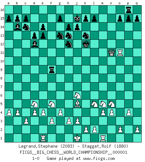 Last move : 1-0 2011 November 8 8:42:0 [Event "FICGS__BIG_CHESS__WORLD_CHAMPIONSHIP__000001"] [Site "FICGS"] [Date "2011.05.10"] [Round "1"] [White "Legrand,Stephane"] [Black "Staggat,Rolf"] [Result "1-0"] [WhiteElo "2083"] [BlackElo "1880"] 1.m2-m4 j15-k13 2.p1-o3 m15-m13 3.b1-c3 n15-n13 4.e2-e4 e15-e13 5.j2-k4 p16-o14 6.n2-n4 d15-d13 7.h1-o7 h15-g13 8.f1-b5 b16-c14 9.o1-f9 f16-c13 10.d2-d4 o16-g9 11.l1-o4 l16-p12 12.c1-k8 c16-l8 13.g1-f3 h16-l13 14.k1-l3 g16-f14 15.m1-m3 l8-m9 16.o7-n6 k16-l14 17.n6-g6 g9-e11 18.c3-d5 p12-n10 19.f9-j6 m9-j6 20.k4-j6 l14-m12 21.h2-j4 f14-h13 22.j4-l5 m12-l10 23.k8-h10 l13-l12 24.a2-a4 l10-j11 25.e1-e3 n10-m11 26.g6-d9 l12-g12 27.d9-b9 g13-e12 28.f3-h4 c13-b14 29.a1-e1 e16-e14 30.e3-g3 g12-k9 31.b9-d7 a16-d16 32.l3-m5 k13-h12 33.d7-j12 j11-k13 34.b5-h11 k9-l9 35.h10-k8 l9-a9 36.k8-f4 a9-a5 37.b2-b4 a5-a7 38.h11-e14 f15-e14 39.c2-c3 d16-f16 40.o4-k8 e12-g13 41.j12-e8 f16-f11 42.g3-g7 a7-d10 43.k8-h6 d10-n10 44.g7-n7 n10-q10 45.o3-n5 e11-d12 46.m3-q3 q10-o10 47.q3-o3 o10-q10 48.n7-p7 q16-p16 49.e8-h5 j16-j15 50.h4-f5 m16-f16 51.g2-g4 f11-h11 52.h5-j4 q10-q12 53.h6-j5 q12-k12 54.p7-n7 n13-n12 55.q1-m1 f16-f9 56.f2-f3 m11-l10 57.j4-p10 l10-q5 58.p2-p4 q5-m9 59.o3-o14 m9-o11 60.p10-o10 n12-n11 61.f4-n11 m13-m12 62.o14-o11 m12-n11 63.n7-n11 h11-n11 64.o10-n11 1-0 Follow this game move after move (download)What would Chess be without silly mistakes ? (Kurt Richter) Es hat in meinem Leben Zeiten gegeben, da ich sehr nahe daran war zu glauben, daß ich auch nicht eine einzige Schachpartie verlieren könnte. (José Raúl Capablanca) En posiciones complicadas, Bobby Fischer pocas veces tuvo que temer de cualquiera. (Paul Keres) A ce moment-là, je menaçais de comprendre la position ! (Clément L'Heureux) Just because you do not take an interest in politics doesn't mean politics won't take an interest in you. (Pericles 430 B.C.)