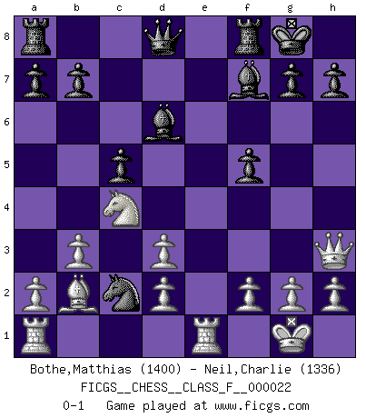 Last move : 0-1 2007 February 5 17:51:5 [Event "FICGS__CHESS__CLASS_F__000022"] [Site "FICGS"] [Date "2006.12.22"] [Round "1"] [White "Bothe,Matthias"] [Black "Neil,Charlie"] [Result "0-1"] [WhiteElo "1400"] [BlackElo "1336"] 1.e4 e6 2.Nf3 d5 3.Nc3 dxe4 4.Ne5 Nf6 5.Qe2 Bd6 6.Nc4 Nc6 7.Nxe4 Nxe4 8.Qxe4 O-O 9.Bd3 f5 10.Qf3 e5 11.O-O e4 12.Qh5 exd3 13.cxd3 Nd4 14.b3 Be6 15.Bb2 c5 16.Rfe1 Bf7 17.Qh3 Nc2 0-1 French defense Kingside Castling by player Black (move 8) Kingside Castling by player White (move 11) Player Black won this chess game. Follow this game move after move (download)If I win a tournament, I win it by myself. I do the playing. Nobody helps me. (Bobby Fischer) Die meiste Zeit treffe ich auf Gegner, die meine Enkel sein könnten. Ich bin da, um ihnen zu zeigen, dass sie von mir noch einiges lernen können. (Viktor Kortschnoi) Cuando tu no sabes absolutamente que mas hacer, es tiempo de entrar en pánico. (John van der Wiel) Il vaut mieux sacrifier les pièces de l'adversaire. (Xavier Tartacover) Do not put your faith in what statistics say until you have carefully considered what they do not say. (William W. Watt)