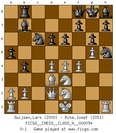 Last move : 0-1 2011 July 31 9:3:49 [Event "FICGS__CHESS__CLASS_A__000094"] [Site "FICGS"] [Date "2011.05.12"] [Round "1"] [White "Swijsen,Lars"] [Black "Riha,Josef"] [Result "0-1"] [WhiteElo "2000"] [BlackElo "2051"] 1.e4 c5 2.c3 d6 3.d4 Nf6 4.f3 cxd4 5.cxd4 g6 6.Nc3 Bg7 7.Be3 O-O 8.Qd2 a6 9.Bd3 Nc6 10.Nge2 b5 11.h4 e6 12.h5 Nxh5 13.g4 Nf6 14.Bh6 Bh8 15.Bxf8 Qxf8 16.g5 Nh5 17.Bc2 Rb8 18.f4 b4 19.Nd1 a5 20.Ne3 Ba6 21.Bd3 Bb7 22.Bc2 Ba6 23.Bd3 Bb7 0-1 Sicilian : Alapin's variation (2.c3) Kingside Castling by player Black (move 7) Player Black won this chess game. Follow this game move after move (download)If you aren't afraid of Spassky, then I have removed the element of money. (Jim Slater) Wie gewinnt Tal? Er entwickelt alle seine Figuren in die Brettmitte und opfert sie dann irgendwo. (Robert James Fischer) No es suficiente ser un buen jugador, se debe también de jugar bién. (Siegbert Tarrasch) Le jeu d'échecs fait naître et fortifie en nous plusieurs qualités précieuses dans le cours de l'existence, telles que la prévoyance, la circonspection, la prudence, et la persévérance. (Benjamin Franklin - 1783, la morale des échecs) Do you know these so called Volunteers don't even get paid! (Simpsons)