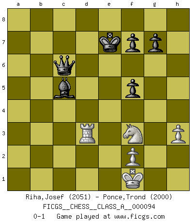Last move : 0-1 2011 May 25 16:6:24 [Event "FICGS__CHESS__CLASS_A__000094"] [Site "FICGS"] [Date "2011.05.12"] [Round "1"] [White "Riha,Josef"] [Black "Ponce,Trond"] [Result "0-1"] [WhiteElo "2051"] [BlackElo "2000"] 1.e4 c6 2.d4 d5 3.exd5 cxd5 4.c4 Nf6 5.Nc3 Nc6 6.Bg5 dxc4 7.d5 Na5 8.Bxc4 Nxc4 9.Qa4+ Bd7 10.Qxc4 h6 11.Bxf6 exf6 12.Nf3 Qe7+ 13.Kf1 Rc8 14.Qd3 Qb4 15.Qe2+ Kd8 16.a3 Qb6 17.h3 Bd6 18.Qd2 Re8 19.Rc1 Bb5+ 20.Kg1 Rc4 21.Rd1 Ba6 22.g4 h5 23.gxh5 Rh8 24.Kg2 Bf4 25.Qc2 Rxh5 26.Rhe1 Qc7 27.Ng1 Qc8 28.Rd3 Qf5 29.Qd1 Bd6 30.Rf3 Rg5+ 31.Kh1 Rf4 32.R1e3 Rxf3 33.Qxf3 Bf1 34.Ne4 Bg2+ 35.Qxg2 Rxg2 36.Kxg2 Bf4 37.Re1 Be5 38.Ng3 Qd3 39.Re2 Qb3 40.Nf3 Bxb2 41.a4 a5 42.d6 b5 43.axb5 a4 44.Re7 a3 45.Ra7 Qxb5 46.Nf1 Qb3 47.N1d2 Qd5 48.Nf1 a2 49.Ne3 Bd4 50.Rxa2 Bxe3 51.Rb2 Bf4 52.Rb4 Bxd6 53.Rd4 Qc6 54.Kg1 Ke7 55.Rd3 Bc5 56.Kf1 f5 0-1 Caro-Kann : Panov-Botvinnik, Herzog defense Player Black won this chess game. Follow this game move after move (download)Pawns are born free, yet they are everywhere in chains. (Rick Kennedy) Kasparov ist eine Art Monster mit hundert Augen, denen auch nicht das Geringste entgeht. (Tony Miles) Cuando la partida de Ajedrez termina, el Peón y el Rey regresan a la misma caja. (Irish saying) Aucun coup ne doit être joué sans but. (Pedro Damiano) The hypothalamus is one of the most important parts of the brain, involved in many kinds of motivation, among other functions. The hypothalamus controls the 'Four Fs: Fighting, Fleeing, Feeding and Mating. (Unknown author)