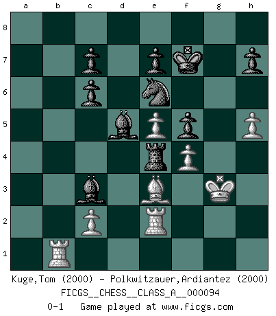 Last move : 0-1 2011 August 29 5:31:22 [Event "FICGS__CHESS__CLASS_A__000094"] [Site "FICGS"] [Date "2011.05.12"] [Round "1"] [White "Kuge,Tom"] [Black "Polkwitzauer,Ardiantez"] [Result "0-1"] [WhiteElo "2000"] [BlackElo "2000"] 1.f4 Nf6 2.Nf3 g6 3.Nc3 d5 4.d3 Bg7 5.e4 dxe4 6.dxe4 Qxd1+ 7.Kxd1 Be6 8.Ke1 Nc6 9.Bb5 O-O 10.Bxc6 bxc6 11.h3 Rab8 12.Ne5 Rb6 13.Nd3 Nd7 14.Be3 Rxb2 15.Nxb2 Bxc3+ 16.Kf2 Bxb2 17.Rab1 Rb8 18.Bxa7 Rb7 19.Be3 Bxa2 20.Rbd1 Be6 21.g4 f5 22.gxf5 gxf5 23.e5 Rb4 24.Rhg1+ Kf7 25.h4 Rc4 26.Rd2 Bd5 27.h5 Nf8 28.Rb1 Bc3 29.Re2 Ne6 30.Kg3 Re4 0-1 Bird's Opening Kingside Castling by player Black (move 9) Player Black won this chess game. Follow this game move after move (download)First-class players lose to second-class players because second-class players sometimes play a first-class game. (Siegbert Tarrasch) Nur ein wirklich starker Spieler weiß wie schwach er spielt. (Savielly Grigorievitsch Tartakower) Con el fin de mejorar tu juego, debes de estudiar los finales antes que todo, ya que mientras que los finales pueden ser estudiados y dominados por sí mismos, el juegomedio y la apertura deben de ser estudiados en relación con los finales. (José Raúl Capablanca) Mais n'est-ce pas déjà le limiter injurieusement que d'appeler les échecs un jeu? N'est-ce pas aussi une science, un art, ou quelque chose qui, comme le cercueil de Mahomet entre ciel et terre, est suspendu entre l'un et l'autre, et qui réunit un nombre incroyable de contraires ? (Stefan Zweig) After growing wildly for years, the field of computing appears to be reaching its infancy. (John Pierce)