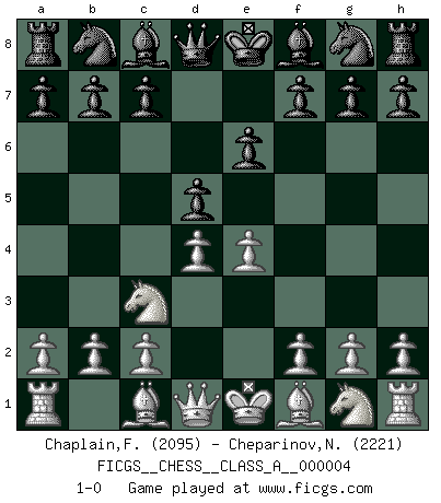 Last move : 1-0 2006 June 17 11:6:2 [Event "FICGS__CHESS__CLASS_A__000004"] [Site "FICGS"] [Date "2006.05.04"] [Round "1"] [White "Chaplain,Fabrice"] [Black "Cheparinov,Nedelcho"] [Result "1-0"] [WhiteElo "2095"] [BlackElo "2221"] 1.e4 e6 2.d4 d5 3.Nc3 1-0 This chess game has been lost on time (started : 2006.05.04 11:27:39) French : Paulsen variation Player White won this chess game. Follow this game move after move (download)Those who say they understand Chess, understand nothing. (Robert Hubner) Ich habe Kasparov in Rente geschickt. (Veselin Topalov) La belleza de un movimiento no se refleja solo en su apariencia, sino en el pensamiento detrás de él. (Siegbert Tarrasch) Une platitude souvent récitée à propos des Echecs est qu'une des choses les plus difficiles à réaliser est de gagner une position gagnante. Cela ne manque pas de sens mais, pour ma part, j'ai toujours trouvé plus difficile de gagner une position perdante. (Tim Krabbe) Convictions are more dangerous enemies of truth than lies. (Friedrich Nietzsche)