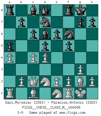 Last move : 1-0 2011 July 18 8:25:10 [Event "FICGS__CHESS__CLASS_M__000045"] [Site "FICGS"] [Date "2011.05.12"] [Round "1"] [White "Gazi,Miroslav"] [Black "Palacios,Antonio"] [Result "1-0"] [WhiteElo "2281"] [BlackElo "2320"] 1.d4 d5 2.c4 c6 3.Nf3 e6 4.Nbd2 f5 5.g3 Nf6 6.Bg2 Bd6 7.O-O Nbd7 8.a4 a5 9.Ne1 O-O 10.Qc2 1-0 This chess game has been lost on time (started : 2011.05.12 22:50:15) QGD Slav : 3.Nf3 Kingside Castling by player White (move 7) Kingside Castling by player Black (move 9) Player White won this chess game. Follow this game move after move (download)As one by one I mowed them down, my superiority soon became apparent. (Jose Capablanca) Wir irren allesamt, nur jeder irrt anders. (Georg Christoph Lichtenberg) Prefiero perder una partida realmente buena, que ganar una mala. (David Levy) Comme les marins qui ont mille raisons différentes d'aller en mer, les joueurs d'échecs en ont tout autant avant de s'installer devant une table et jouer... (Vincent Bertignac, philosophe) Creativity is allowing yourself to make mistakes. Art is knowing which ones to keep. (Scott Adams)