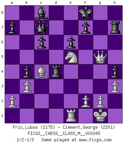 Last move : 1/2-1/2 2011 July 13 1:3:27 [Event "FICGS__CHESS__CLASS_M__000045"] [Site "FICGS"] [Date "2011.05.12"] [Round "1"] [White "Fric,Lubos"] [Black "Clement,George"] [Result "1/2-1/2"] [WhiteElo "2175"] [BlackElo "2201"] 1.d4 Nf6 2.c4 e6 3.Nc3 d5 4.Nf3 c6 5.Bg5 h6 6.Bh4 dxc4 7.e4 g5 8.Bg3 b5 9.Be2 b4 10.Na4 Nxe4 11.Be5 Nf6 12.O-O Nbd7 13.Bxc4 g4 14.Bxf6 Qxf6 15.Ne5 Nxe5 16.dxe5 Qxe5 17.Qxg4 Bd7 18.Rad1 h5 19.Qf3 Rd8 20.Rfe1 Qc7 21.Rd3 h4 22.h3 Be7 23.b3 Rh6 24.Qg4 Kf8 25.Nc5 Bc8 26.Rf3 Bf6 27.Rxf6 Rxf6 28.Nd3 Rh6 29.Qg5 Rh7 30.Ne5 Rd4 31.Ng6+ Ke8 32.Ne5 Kf8 1/2-1/2 Queen's pawn game Kingside Castling by player White (move 12) This chess game ended in a draw. Follow this game move after move (download)Not all artists are Chess players, but all Chess players are artists. (Marcel Duchamp) Im Leben werden Partien nie so unstrittig gewonnen wie im Spiel (Emanuel Lasker) Por esta medida (el intervalo entre Fischer y sus contemporaneos), yo le considero el mas grande campeón mundial. (Garry Kasparov) Aucun coup ne doit être joué sans but. (Pedro Damiano) A proverb is a short sentence based on long experience. (Miguel de Cervantes)