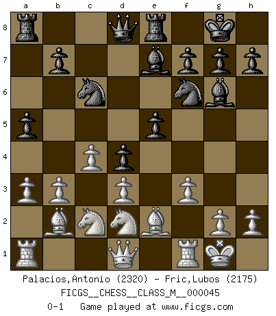 Last move : 0-1 2011 October 16 0:0:43 [Event "FICGS__CHESS__CLASS_M__000045"] [Site "FICGS"] [Date "2011.05.12"] [Round "1"] [White "Palacios,Antonio"] [Black "Fric,Lubos"] [Result "0-1"] [WhiteElo "2320"] [BlackElo "2175"] 1.c4 e6 2.Nf3 Nf6 3.b3 d5 4.e3 Be7 5.Be2 O-O 6.O-O c5 7.Bb2 Nc6 8.d3 d4 9.exd4 cxd4 10.Na3 e5 11.Nc2 Re8 12.a3 a5 13.Nd2 Bf5 14.f3 Bg6 0-1 This chess game has been lost on time (started : 2011.05.12 22:50:15) English Opening Kingside Castling by player Black (move 5) Kingside Castling by player White (move 6) Player Black won this chess game. Follow this game move after move (download)The older I grow, the more I value Pawns. (Keres) Die Jungen erwarten, dass Opa einfach umfällt. Dann aber kann Opa fünf Stunden lang Schach spielen und die jungen Gegner an die Wand drücken. (Viktor Kortschnoi) Estaba muy claro de que el punto vulnerable del Gran Maestro Americano (Bobby Fischer) radicaba en las posiciones de doble filo, colgantes, irracionales, donde el siempre falló en encontrar un triunfo aún en una posición de clara victoria. (Efim Geller) Le joueur d'Echecs qui veut atteindre le top est obligé de développer son propre credo créatif. Alexeï Stepanovicth Souétine. Il est facile d'écrire des livres ! Ce qui est difficile, c'est de jouer ! (Alexeï Stepanovicth Souétine) If you lose the game you should win the analysis! (Proverb)