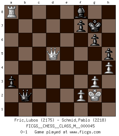 Last move : 0-1 2012 January 15 18:14:14 [Event "FICGS__CHESS__CLASS_M__000045"] [Site "FICGS"] [Date "2011.05.12"] [Round "1"] [White "Fric,Lubos"] [Black "Schmid,Pablo"] [Result "0-1"] [WhiteElo "2175"] [BlackElo "2218"] 1.d4 Nf6 2.c4 g6 3.Nc3 d5 4.cxd5 Nxd5 5.e4 Nxc3 6.bxc3 c5 7.Nf3 Bg7 8.Rb1 O-O 9.Be2 cxd4 10.cxd4 Qa5+ 11.Bd2 Qxa2 12.O-O Bg4 13.Bg5 h6 14.Be3 Nc6 15.d5 Bxf3 16.Bxf3 Ne5 17.Rxb7 a5 18.Be2 Nc4 19.Rxe7 Qa3 20.Bxc4 Qxe7 21.d6 Qxe4 22.Bd5 Qb4 23.Bxa8 Rxa8 24.Qd5 Rd8 25.Bc5 Qb5 26.Rd1 a4 27.g3 Bf8 28.Qe5 Re8 29.Qxe8 Qxe8 30.d7 Qd8 31.Bb6 Qxb6 32.d8Q Qc5 33.Qd5 Qe7 34.Kg2 a3 35.Rb1 Qf6 36.h4 Kg7 37.Rb8 h5 38.Ra8 Qb2 0-1 This chess game has been lost on time (started : 2011.05.12 22:50:15) King's Indian defense, 3.Nc3 Kingside Castling by player Black (move 8) Kingside Castling by player White (move 12) Promotion Queen by player White (move 32) Player Black won this chess game. Follow this game move after move (download)Chess is a fairy tale of 1001 blunders. (Savielly Tartakower) Gegen einen Schachcomputer zu verlieren ist wie Löcher in den Strümpfen zuhaben. Es ist nicht peinlich, solange man der einzige ist der es weiß. (Anonymous) La pasion por jugar al Ajedrez es una de las mas inexplicables en el mundo. (H.G. Wells) Les erreurs sont comme les malheurs, elles n'arrivent jamais seules. (Siegbert Tarrasch) Computers have lots of memory but no imagination. (Anonymous)