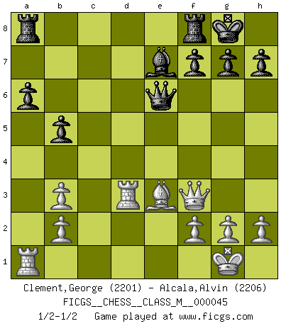Last move : 1/2-1/2 2011 August 26 16:58:24 [Event "FICGS__CHESS__CLASS_M__000045"] [Site "FICGS"] [Date "2011.05.12"] [Round "1"] [White "Clement,George"] [Black "Alcala,Alvin"] [Result "1/2-1/2"] [WhiteElo "2201"] [BlackElo "2206"] 1.e4 c5 2.c3 Nf6 3.e5 Nd5 4.Nf3 Nc6 5.d4 cxd4 6.Bc4 Nb6 7.Bb3 d5 8.exd6 Qxd6 9.O-O Be6 10.Nxd4 Nxd4 11.cxd4 Bxb3 12.axb3 e6 13.Nc3 Be7 14.Qf3 Qd7 15.Rd1 O-O 16.d5 Nxd5 17.Nxd5 exd5 18.Rxd5 Qe6 19.Be3 a6 20.Rd3 b5 1/2-1/2 Sicilian : Alapin's variation (2.c3) Kingside Castling by player White (move 9) Kingside Castling by player Black (move 15) This chess game ended in a draw. Follow this game move after move (download)In complicated positions, Bobby Fischer hardly had to be afraid of anybody. (Paul Keres) Schach ist das Spiel, das die Verrückten gesund hält. (Albert Einstein) El Ajedrez expande y enriquece tu mente. (Saudin Robovic) Les écrivains ont utilisé les échecs pour analyser les côtés extrêmes de la nature humaine. Dans ce cadre, les échecs offrent un champ d'expérimentation idéal. Mais on pourrait faire la même chose avec la peinture. Et là, en vous référant à Van Gogh, vous ne tirerez pas de conclusion définitive sur les peintres. (Gary Kasparov) It is not enough to be a good player... you must also play well. (Siegbert Tarrasch)