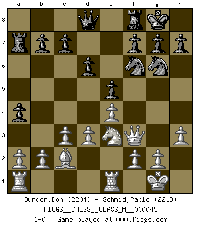 Last move : 1-0 2011 October 12 23:46:44 [Event "FICGS__CHESS__CLASS_M__000045"] [Site "FICGS"] [Date "2011.05.12"] [Round "1"] [White "Burden,Don"] [Black "Schmid,Pablo"] [Result "1-0"] [WhiteElo "2204"] [BlackElo "2218"] 1.e4 e5 2.Nf3 Nc6 3.Bc4 Nf6 4.d3 Bc5 5.c3 d6 6.Bb3 a6 7.O-O Ba7 8.Be3 O-O 9.Bxa7 Rxa7 10.Nbd2 Ne7 11.Re1 Ng6 12.Nf1 Bg4 13.h3 Bxf3 14.Qxf3 a5 15.Ne3 a4 16.Bc2 1-0 This chess game has been lost on time (started : 2011.05.12 22:50:15) Two knights defense (Modern Bishop's Opening) Kingside Castling by player White (move 7) Kingside Castling by player Black (move 8) Player White won this chess game. Follow this game move after move (download)The winner of the game is the player who makes the next-to-last mistake. (Savielly Tartakover) Es ist im Leben wie im Schachspiel. Wir entwerfen einen Plan, dieser bleibt jedoch bedingt durch das, was im Schachspiel dem Gegner, im Leben dem Schicksal zu tun belieben wird. (Arthur Schopenhauer) Tu sabes, camarada Pachman, no disfruto el ser un Ministro, preferería jugar al Ajedrez como tu. (Che Guevara) Les Echecs ont trois composantes : le temps, l'espace et le matériel en dernier. (Mikhail Tal) I've never seen so many men wasted so badly. (Blondie in The Good, The Bad and The Ugly)
