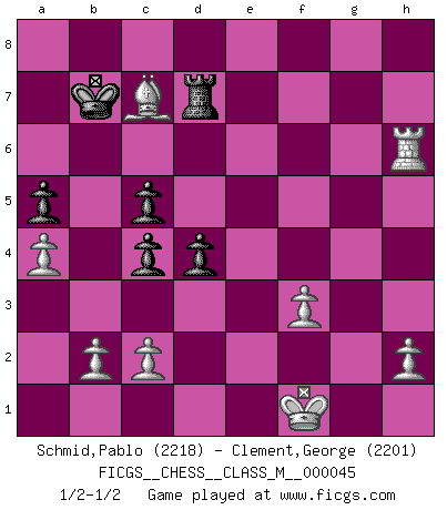 Last move : 1/2-1/2 2011 August 1 17:27:44 [Event "FICGS__CHESS__CLASS_M__000045"] [Site "FICGS"] [Date "2011.05.12"] [Round "1"] [White "Schmid,Pablo"] [Black "Clement,George"] [Result "1/2-1/2"] [WhiteElo "2218"] [BlackElo "2201"] 1.e4 e5 2.Nf3 Nc6 3.d4 exd4 4.Bc4 Nf6 5.e5 d5 6.Bb5 Ne4 7.Nxd4 Bd7 8.Bxc6 bxc6 9.O-O Bc5 10.f3 Ng5 11.Be3 Bb6 12.f4 Ne4 13.Nd2 Nxd2 14.Qxd2 c5 15.Nf3 d4 16.Bf2 Bc6 17.a4 Bxf3 18.gxf3 a5 19.f5 Qd5 20.Qg5 c4 21.Rad1 g6 22.Kg2 gxf5 23.Rfe1 h6 24.Qxf5 Rg8+ 25.Kh1 Rg5 26.Qf4 Rg6 27.e6 Rxe6 28.Qf6 c5 29.Rxe6+ fxe6 30.Re1 Bd8 31.Rxe6+ Kd7 32.Qf7+ Kc8 33.Qe8 Ra7 34.Kg2 Rg7+ 35.Bg3 Qd7 36.Qxd7+ Rxd7 37.Kf1 Kb7 38.Rxh6 Bc7 39.Bxc7 1/2-1/2 Scotch gambit : Dubois-Reti defense Kingside Castling by player White (move 9) This chess game ended in a draw. Follow this game move after move (download)A sacrifice is best refuted by accepting it. (Wilhelm Steinitz) Kasparov stellt für gewöhnlich die Regeln auf und bricht sie dann selbst wieder. (Alexej Shirov) Un jugador que es sorprendido, esta derrotado a medias. (Proverbio) Il vaut toujours mieux jouer un plan faux de façon logique que de n'avoir pas de plan du tout. (Victor Kortchnoï) The absolute truth is the thing that makes people laugh. (Carl Reiner)