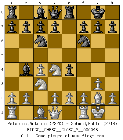 Last move : 0-1 2011 July 31 21:3:46 [Event "FICGS__CHESS__CLASS_M__000045"] [Site "FICGS"] [Date "2011.05.12"] [Round "1"] [White "Palacios,Antonio"] [Black "Schmid,Pablo"] [Result "0-1"] [WhiteElo "2320"] [BlackElo "2218"] 1.c4 Nf6 2.Nc3 e5 3.g3 Bb4 4.Bg2 O-O 5.Nf3 Re8 6.O-O e4 7.Nd4 Nc6 0-1 This chess game has been lost on time (started : 2011.05.12 22:50:15) English Opening Kingside Castling by player Black (move 4) Kingside Castling by player White (move 6) Player Black won this chess game. Follow this game move after move (download)Chess is in its essence a game, in its form an art, and in its execution a science. (Baron Tassilo) Die westlichen Werte sind eine Sprache, welche die Putin-Administration nicht versteht. (Garry Kasparov) El Ajedrez se juega con la mente... ¡no con las manos!. (Renaud y Kahn) Les échecs sont plus proches de l'art de l'assassinat que de l'art de la guerre. (Arturo Perez-Reverte) Watch your thoughts; they become words. Watch your words; they become actions. Watch your actions; they become habits. Watch your habits; they become character. Watch your character; it becomes your destiny. (Frank Outlaw)