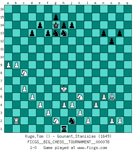 Last move : 1-0 2011 June 11 22:46:27 [Event "FICGS__BIG_CHESS__TOURNAMENT__000078"] [Site "FICGS"] [Date "2011.05.13"] [Round "1"] [White "Kuge,Tom"] [Black "Gounant,Stanislas"] [Result "1-0"] [WhiteElo ""] [BlackElo "1649"] 1.c2-c4 j15-h13 2.h2-g4 n15-n13 3.j2-k4 o16-l13 4.d2-d4 o15-o13 5.n2-n4 m15-m14 6.h1-p8 p15-p14 7.c1-p13 m16-o16 8.m2-m4 l13-n11 9.b1-c3 q15-q14 10.p13-n11 h16-n11 11.p8-p14 n11-p13 12.p14-p13 q14-p13 13.p1-o3 d15-d13 14.l1-o4 c15-c14 15.e2-e4 o13-o12 16.g1-j2 c16-m7 17.j2-h4 e15-e14 18.k1-l3 l16-o13 19.o1-g8 f16-b12 20.l3-m5 p16-n15 21.c4-c5 n15-l14 22.f1-c4 g16-f14 23.a2-a4 h15-j13 24.m5-k6 m7-p10 25.k4-m5 k16-h15 26.a4-a5 b16-d15 27.a5-a6 f14-e12 28.a6-a7 f15-f13 29.a7-a8 p10-n12 30.o4-m2 b12-m2 31.o3-m2 h15-g13 32.a8-a9 j16-h15 33.j1-h2 q16-q6 34.a1-a6 o16-q16 35.m2-o3 q16-q8 36.e1-a1 d15-f14 37.a6-b6 b15-b13 38.a1-a7 n12-l10 39.f2-f3 f14-g12 40.a7-c7 g12-f10 41.g8-k5 f10-e8 42.c7-c14 a16-c16 43.b6-c6 c16-c14 44.c6-c14 e16-q16 45.k5-b13 l10-q5 46.b13-n2 q5-o3 47.n2-o3 q6-q2 48.q1-q2 q8-q2 49.m5-l7 e12-f10 50.c14-c15 q16-b16 51.b2-b3 l14-m12 52.c15-a15 o13-n14 53.c3-d5 f10-d9 54.h4-f5 e8-c7 55.g4-e3 c7-b5 56.d5-b6 n14-c4 57.e3-c4 d9-b8 58.n4-n5 b8-c6 59.d4-d5 c6-d4 60.f5-d4 b5-d4 61.b3-b4 d4-c2 62.b4-b5 c2-d4 63.c4-d6 b16-q16 64.m1-c1 m12-n10 65.k6-h5 d4-b3 66.c1-c3 b3-d2 67.h5-g3 q2-q1 68.a15-a10 n10-l9 69.a10-l10 j13-k11 70.l10-l15 d2-f1 71.g3-f1 q1-f1 72.l15-k15 h15-g14 73.o3-n4 q16-q1 74.k15-m15 l9-m7 75.m15-m14 m7-k6 76.j3-j4 k6-l4 77.k2-k3 l4-m2 78.n4-o5 q1-j1 79.c3-c2 m2-k1 80.h2-g3 j1-j2 81.d6-f5 k1-j3 82.f5-h4 j3-h1 83.g3-f4 j2-k2 84.l7-k5 h1-f2 85.c2-c4 f2-d3 86.f4-f5 k11-h10 87.b6-c8 h10-f9 88.m14-m7 f9-d8 89.m7-a7 d3-f2 90.c4-c3 f2-d1 91.c3-b3 f1-e1 92.f5-f6 d1-e3 93.a7-a2 d8-b7 94.c5-c6 b7-c9 95.b5-b6 c9-e8 96.f6-g5 e3-g2 97.a2-g2 k2-g2 98.h4-g2 e1-g1 99.b3-b2 e8-g7 100.b6-b7 g7-j6 101.g5-h6 j6-k4 102.h3-h4 g1-h1 103.b7-b8 k4-j2 104.b8-b9 1-0 Follow this game move after move (download)In life, as in Chess, one's own Pawns block one's way. A man's very wealth, ease, leisure, children, books, which should help him to win, more often checkmate him. (Charles Buxton) Im Internet Chess Club betrug mein Rating vorübergehend 3350 ELO-Punkte. (Sergej Karjakin) Alguna parte de un error es siempre correcto. (Savielly Tartakover) La vie est comme un jeu d'échecs : nous esquissons un plan, mais celui-ci est tributaire de ce que daignent faire l'adversaire aux échecs et le destin dans la vie. (Arthur Schopenhauer) First of all, we have to go back to the classical time control. (Anatoly Karpov)