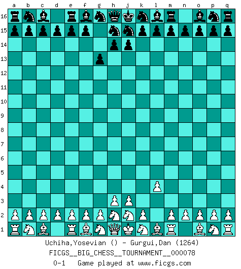 Last move : 0-1 2011 June 14 7:45:17 [Event "FICGS__BIG_CHESS__TOURNAMENT__000078"] [Site "FICGS"] [Date "2011.05.13"] [Round "1"] [White "Uchiha,Yosevian"] [Black "Gurgui,Dan"] [Result "0-1"] [WhiteElo ""] [BlackElo "1264"] 1.l2-l4 g15-g13 0-1 This big chess game has been lost on time (started : 2011.05.13 4:32:9) Follow this game move after move (download)If your opponent offers you a draw, try to work out why he thinks he's worse off. (Nigel Short) Um sich vor der Gefahr einer Erkältung zu schützen, sorge der wanderlustige König beizeiten für ein brauchbares Versteck. (Aaron Nimzowitsch) Peones: ellos son el alma de esta partida, solos forman el ataque y la defensa. (Philidor) Roi des jeux et jeu des rois, les échecs portent en eux un sentiment d'infini. Ils donnent à celui qui s'est efforcé d'en approfondir les arcanes l'impression de n'être pas à la mesure de l'homme; en fait, ils constituent un résumé de l'univers, un microcosme, et figurent cette grande échelle qui, dans les plans de la lumière descend jusqu'à la matière, qui des abîmes insondables remonte jusqu'en l'infini de Dieu. (Pyrame) Programmer - an organism that turns coffee into software. (Anonymous)