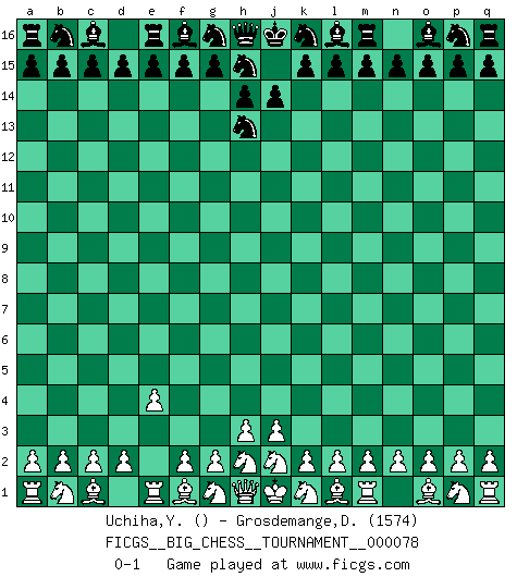 Last move : 0-1 2011 June 14 19:45:38 [Event "FICGS__BIG_CHESS__TOURNAMENT__000078"] [Site "FICGS"] [Date "2011.05.13"] [Round "1"] [White "Uchiha,Yosevian"] [Black "Grosdemange,David"] [Result "0-1"] [WhiteElo ""] [BlackElo "1574"] 1.e2-e4 j15-h13 0-1 This big chess game has been lost on time (started : 2011.05.13 4:32:9) Follow this game move after move (download)Every Chess master was once a beginner. (Chernev) Vielleicht wirkt die Aura früherer Spieler glanzvoller als die der heutigen Spieler, aber das liegt daran, dass man kein Programm wie Fritz hatte, das einem all die Löcher in ihren Partien zeigt. (Vladimir Kramnik) Puntos débiles o agujeros en la posición de tu oponente deben de ser ocupados por piezas, no Peones. (Siegbert Tarrasch) On peut tirer plus d'utilité d'une partie perdue que de 100 parties gagnées. (Capablanca) If only faces could talk... (Pat Summerall, Sportscaster during the Super Bowl)