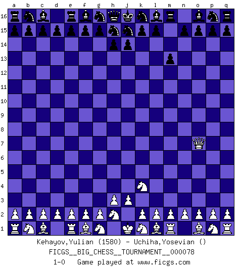 Last move : 1-0 2011 June 16 19:50:24 [Event "FICGS__BIG_CHESS__TOURNAMENT__000078"] [Site "FICGS"] [Date "2011.05.13"] [Round "1"] [White "Kehayov,Yulian"] [Black "Uchiha,Yosevian"] [Result "1-0"] [WhiteElo "1580"] [BlackElo ""] 1.j2-k4 m15-m13 2.h1-o7 1-0 This big chess game has been lost on time (started : 2011.05.13 4:32:9) Follow this game move after move (download)Whoever sees no other aim in the game than that of giving checkmate to one's opponent will never become a good Chess player. (Euwe) Die Leute spielen gegen mich seit 15 Jahren unter Ihren Möglichkeiten. (Robert James Fischer) Creo que una cierta cantidad de temperamento es esperada de los genios del Ajedrez. (Ron Gross) Vous m'avez demandé de vous exposer quel est le fondement de la prière. Je ne fais que préparer les pièces du jeu sur la table... Nous sera-t-il permis d'en adopter les règles et si nous les appliquons scrupuleusement nous ne tarderons pas à faire mat le Roi divin ! Il ne pourra échapper à nos mains. (Sainte Thérèse d'Avila, Chemin de perfection) Think like a man of action, act like a man of thought. (Henri Louis Bergson)