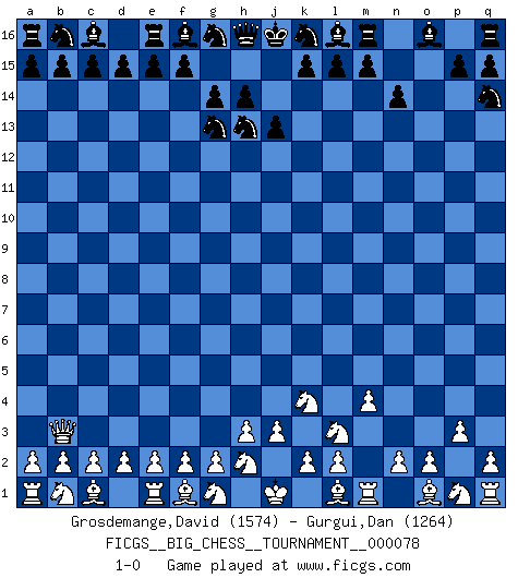 Last move : 1-0 2011 June 19 7:57:42 [Event "FICGS__BIG_CHESS__TOURNAMENT__000078"] [Site "FICGS"] [Date "2011.05.13"] [Round "1"] [White "Grosdemange,David"] [Black "Gurgui,Dan"] [Result "1-0"] [WhiteElo "1574"] [BlackElo "1264"] 1.j2-k4 h15-g13 2.k1-l3 j15-h13 3.m2-m4 j14-j13 4.h1-o7 g15-g14 5.o7-o15 p16-q14 6.o15-b3 n15-n14 7.p2-p3 1-0 This big chess game has been lost on time (started : 2011.05.13 4:32:9) Follow this game move after move (download)A bad day of Chess is better than any good day at work. (Anonymous) Frage des Reporters: -Welche besonderen Umstände rechtfertigen das Anhalten der Uhren während einer Turnierpartie? Antwort: -Einen Fotographen zu strangulieren. (Siegbert Tarrasch) Un jugador que es sorprendido, esta derrotado a medias. (Proverbio) Karpov est une pièce de musée. (Garry Kasparov) The real voyage of discovery consists not in seeking new lands but in seeing with new eyes. (Marcel Proust)