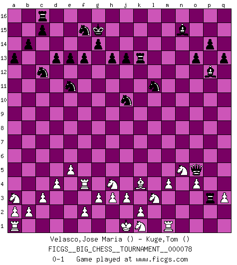 Last move : 0-1 2011 May 23 19:48:34 [Event "FICGS__BIG_CHESS__TOURNAMENT__000078"] [Site "FICGS"] [Date "2011.05.13"] [Round "1"] [White "Velasco,Jose Maria"] [Black "Kuge,Tom"] [Result "0-1"] [WhiteElo ""] [BlackElo ""] 1.e2-e4 m15-m13 2.d2-d4 l15-l13 3.f1-c4 g15-g14 4.g1-f3 p15-p14 5.n2-n4 o16-p15 6.m2-m4 h16-c11 7.h1-f1 d15-d13 8.l1-m2 c11-o11 9.o2-o4 h14-h13 10.o1-g8 l13-l12 11.f1-d3 f16-n9 12.g2-g3 l16-p12 13.c4-e6 c16-l8 14.f3-h4 b16-d15 15.c2-c3 k16-l14 16.d3-b5 d15-b14 17.b5-f9 n9-l11 18.c1-k8 a16-c16 19.m2-a13 b14-c12 20.a13-h6 f15-f13 21.f9-b9 c12-b14 22.h6-e9 l11-j13 23.e9-a13 k15-k14 24.k8-e13 j13-g11 25.e13-g11 o11-g11 26.p2-p3 h15-f14 27.a13-e9 g11-k8 28.b9-b6 j14-j13 29.g8-f9 m16-m14 30.e9-c7 m14-n14 31.e6-d7 l14-k12 32.f9-g10 e15-e13 33.p1-o3 q15-q13 34.m1-m3 f14-g12 35.c7-d6 k12-j10 36.m3-k3 k8-n11 37.b6-c6 g16-h14 38.g10-l14 j16-h15 39.l14-m13 n14-o14 40.m13-l12 k14-k13 41.l12-k13 j15-k13 42.d7-k13 h15-g15 43.k13-q7 o14-k14 44.k3-k14 n11-k14 45.o3-n5 j10-k12 46.q1-m1 p16-o14 47.d6-g9 q16-l16 48.g9-l5 e16-k16 49.c6-e6 k12-j10 50.h2-k3 o14-m13 51.e6-o6 o15-o13 52.o6-e15 h14-f15 53.l5-m6 p15-k10 54.e15-a11 a15-a14 55.b1-a3 k10-h8 56.e4-e5 b14-c12 57.a11-b12 b15-b14 58.b12-a12 a14-a13 59.e1-e4 l8-h5 60.a12-a10 k14-k9 61.e4-f4 l16-l2 62.q2-q3 h5-k3 63.q7-o5 k3-n6 64.m6-k4 n6-o5 65.n4-o5 m13-l11 66.j2-l3 k9-o5 67.a10-c10 l2-p2 68.c10-c5 h8-g9 69.c5-d5 g12-e11 70.d5-d8 k16-k13 71.d8-n8 p2-p3 72.n8-n15 g9-n15 0-1 Follow this game move after move (download)We don't really know how the game was invented, though there are suspicions. As soon as we discover the culprits, we'll let you know. (Bruce Pandolfini) Die jungen Leute sollen verstehen, dass sie noch etwas von mir lernen können und müssen. (Viktor Kortschnoi) En manos de Fischer's, una diminuta ventaja teórica es tan buena como tener una Reina de ventaja. (Isaac Kashdan) Même si l'adversaire joue le coup analysé précédemment, recommencez l'analyse en voyant la nouvelle position. Première règle de Blumenfeld Unless in communicating with it one says exactly what one means, trouble is bound to result. (Alan Turing, about computers)
