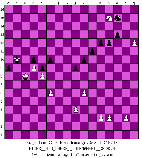 Last move : 1-0 2012 January 13 17:54:5 [Event "FICGS__BIG_CHESS__TOURNAMENT__000078"] [Site "FICGS"] [Date "2011.05.13"] [Round "1"] [White "Kuge,Tom"] [Black "Grosdemange,David"] [Result "1-0"] [WhiteElo ""] [BlackElo "1574"] 1.b2-b3 j15-k13 2.c1-b2 h16-o10 3.j2-h4 o10-o2 4.h1-p8 p16-o14 5.n2-n3 o2-o13 6.e2-e4 g16-f14 7.o1-g8 m15-m13 8.f1-b5 o13-p14 9.p8-m5 l16-o13 10.g8-h9 b16-c14 11.d2-d3 d15-d13 12.p1-n2 c16-f13 13.n2-o4 e15-e14 14.k2-k4 n15-n14 15.l1-k2 f16-d14 16.k2-n5 o16-k12 17.n5-d14 c15-d14 18.b2-j9 f14-e12 19.e4-e5 c14-e13 20.f2-f4 a16-c16 21.e1-e2 k16-l14 22.b1-c3 j16-j15 23.c3-e4 c16-c9 24.b5-c4 e16-c16 25.j9-f6 c9-c11 26.g1-f3 f13-k9 27.f3-g5 k9-j8 28.h9-j8 o13-j8 29.m5-l5 b15-b14 30.k1-l3 h15-g13 31.h2-j4 q15-q13 32.j4-k6 j8-n12 33.l3-j4 q13-q12 34.a2-a4 q12-q11 35.a4-a5 q11-q10 36.a5-a6 p14-p9 37.l5-j5 c11-j11 38.j5-k5 c16-c11 39.j1-h2 m16-c16 40.p2-p3 q10-q9 41.g5-h7 p9-l9 42.f6-e7 j11-l11 43.e7-k12 l14-k12 44.e4-g5 l9-l2 45.h4-j2 l2-l6 46.k5-l6 l11-l6 47.m1-l1 c11-l11 48.l1-l6 l11-l6 49.a1-l1 l6-l1 50.q1-l1 q16-q11 51.e2-e4 c16-c11 52.e4-d4 c11-d11 53.d4-d11 e13-d11 54.j2-h4 q11-l11 55.l1-l11 k13-l11 56.j4-h6 g13-h11 57.c4-b5 e12-f10 58.h4-j6 d11-e9 59.o4-n6 o14-p12 60.h7-f8 h11-g9 61.k6-m7 p12-o10 62.b5-f9 l11-m9 63.g2-g4 k15-k13 64.j6-h8 g15-g13 65.g5-f7 e9-f7 66.h6-f7 g9-f7 67.h8-f7 k12-j10 68.f8-e10 f10-e12 69.e10-d12 j10-g11 70.f9-g10 n12-k9 71.n6-o8 m9-o8 72.m7-o8 j15-h15 73.f7-h8 k9-g12 74.a6-a7 e14-e13 75.d12-b13 a15-a13 76.b3-b4 g12-e10 77.b13-a11 e10-d11 78.g10-e8 h15-g14 79.a11-c10 e12-f10 80.e8-k3 d13-d12 81.c10-e9 d11-e12 82.o8-q9 o10-q9 83.k3-q9 f10-d9 84.c2-c4 d9-c7 85.q9-h1 h14-h13 86.h1-e4 p15-p14 87.h8-k9 e12-k7 88.b4-b5 f15-f13 89.e9-c8 g11-f9 90.c8-b10 f9-d10 91.k9-h10 k7-m9 92.b5-b6 c7-e6 93.h2-g3 e13-e12 94.g3-f3 e6-c5 95.e4-f5 g13-g12 96.f3-e3 g12-g11 97.h10-j8 m9-l10 98.k4-k5 d10-f9 99.b10-c12 f9-h10 100.j8-h10 l10-f5 101.g4-f5 g11-h10 102.c12-b14 g14-f14 103.b14-c12 c5-d7 104.b6-b7 d7-c9 105.b7-b8 c9-b11 106.c12-d14 l15-l13 107.e3-e4 j14-j13 108.d14-e16 f14-f15 109.e16-d14 f15-e14 110.d14-c12 j13-j12 111.f5-f6 e14-d13 112.c12-b10 h13-h12 113.e4-f5 b11-d10 114.d3-d4 k13-k12 115.d4-d5 e12-e11 116.c4-c5 f13-f12 117.c5-c6 f12-f11 118.d5-d6 d13-e12 119.d6-d7 d10-b9 120.a7-a8 b9-c7 121.e5-e6 d12-d11 122.f5-e5 e12-d12 123.e5-d6 c7-b5 124.d6-e5 b5-c7 125.f4-f5 d12-c11 126.a8-a9 c7-a6 127.c6-c7 a6-c7 128.e5-d6 c7-b5 129.d6-c5 b5-c3 130.c5-c6 c3-e2 131.b10-d9 c11-d12 132.c6-d6 e2-f4 133.d9-f8 f4-h3 134.f8-h9 j12-j11 135.m2-m3 h3-j5 136.h9-j7 j5-g4 137.j7-h5 g4-h6 138.k5-k6 h6-f5 139.d6-c7 f5-h6 140.e6-e7 d12-c11 141.c7-c8 h6-f7 142.d7-d8 a13-a12 143.b8-b9 a12-a11 144.h5-g7 f7-d6 145.c8-b8 e11-e10 146.e7-e8 d11-d10 147.b8-c7 d6-f7 148.j3-j4 e10-e9 149.d8-d9 f7-d8 150.c7-c8 l13-l12 151.g7-h9 d8-f7 152.h9-f10 f7-d6 153.c8-c7 d6-b5 154.c7-c8 b5-d6 155.c8-c7 d6-b5 156.c7-c8 j11-j10 157.f10-e12 c11-d11 158.e12-g13 b5-d6 159.c8-d7 d6-b7 160.a9-a10 b7-d8 161.d7-c8 f11-f10 162.g13-f11 d11-c11 163.f11-h10 c11-b10 164.h10-f11 d8-b9 165.f11-h12 k12-k11 166.h12-f11 b10-a10 167.f11-e13 b9-c11 168.e13-g12 c11-e12 169.g12-j13 e12-g13 170.j13-l14 o15-o14 171.l14-k16 g13-j12 172.k16-m15 o14-o13 173.m15-o16 j12-l13 174.o16-p14 a10-b10 175.q2-q4 l13-n12 176.p14-o12 n12-p13 177.q4-q5 m13-m12 178.q5-q6 a11-a10 179.q6-q7 a10-a9 180.q7-q8 n14-n13 181.o12-p14 p13-o15 182.q8-q9 l12-l11 183.q9-q10 n13-n12 184.q10-q11 k11-k10 185.q11-q12 j10-j9 186.p14-n15 1-0 This big chess game has been lost on time (started : 2011.05.13 4:32:9) Follow this game move after move (download)Place the contents of the Chess box in a hat, shake them up vigorously, pour them on the board from a height of two feet, and you get the style of Steinitz. (H. E. Bird) Das typische an einem Großmeister ist, daß er eine gewonnene Position schnell und schmerzlos gewinnt. (Irving Chernev) Antes de los Finales, los dioses han colocado el Juego Medio. (Siegbert Tarrasch) Nous sommes les pions de la mystérieuse partie d'Echecs jouée par Dieu. Il nous déplace, nous arrête, nous pousse encore, puis nous lance un à un dans la boîte du Néant. Epitaphe sur la tombe de David Janowsky (1868-1927). Computer Science is no more about computers than astronomy is about telescopes. (Edsger W. Dijkstra)