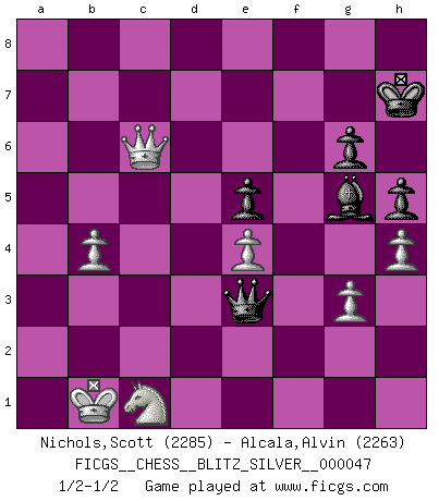 Last move : 1/2-1/2 2011 May 13 18:13:57 [Event "FICGS__CHESS__BLITZ_SILVER__000047"] [Site "FICGS"] [Date "2011.05.13"] [Round "1"] [White "Nichols,Scott"] [Black "Alcala,Alvin"] [Result "1/2-1/2"] [WhiteElo "2285"] [BlackElo "2263"] 1.e4 c5 2.Nf3 d6 3.Nc3 Nf6 4.d4 cxd4 5.Nxd4 a6 6.f3 e5 7.Nb3 Be6 8.Be3 h5 9.Qd2 Nbd7 10.a3 Be7 11.O-O-O b5 12.Kb1 Rc8 13.Nc1 O-O 14.N1a2 Nb6 15.Qf2 Nc4 16.Bg5 Qd7 17.Bxc4 Rxc4 18.Rd3 a5 19.Bxf6 Bxf6 20.Qb6 Ra8 21.Rxd6 Qc8 22.Nd5 Rxc2 23.Rc1 Rxc1+ 24.Nxc1 b4 25.axb4 axb4 26.Qxb4 Kh7 27.Qb5 Bd8 28.Nd3 Ra5 29.Qc6 Qb8 30.g3 Ra8 31.Rxe6 fxe6 32.Qxe6 Qb5 33.Nc1 Qf1 34.Qf5+ g6 35.Qf7+ Kh6 36.Qf8+ Kh7 37.Nf6+ Bxf6 38.Qxa8 Qxf3 39.Qc6 Qe3 40.b4 Bg5 41.h4 1/2-1/2 Sicilian Queenside Castling by player White (move 11) Kingside Castling by player Black (move 13) This chess game ended in a draw. Follow this game move after move (download)Chess opens and enriches your mind. (Saudin Robovic) Ich hatte Angst gegen einen russischen Großmeister zu verlieren, und er befürchtete gegen einen kleinen Jungen zu verlieren. (über ein Remis gegen Juri Awerbach). (Robert James Fischer) El Ajedrez es realmente noventa y nueve por ciento calculación. (Soltis) Horreur, mais aussi harmonie suprême : qu'y avait-il en effet au monde en dehors des échecs ? Le brouillard, l'inconnu, le non-être... (Vladimir Nabokov) It's not enough to succeed. Others must fail. (Gore Vidal)