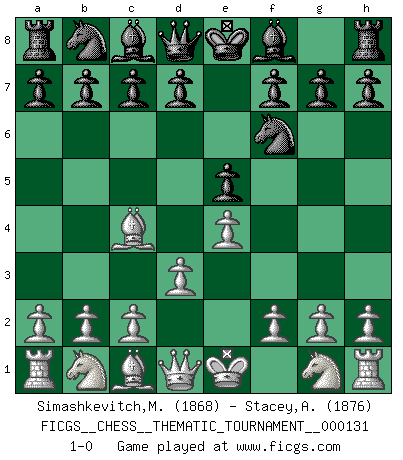 Last move : 1-0 2011 June 23 8:0:58 [Event "FICGS__CHESS__THEMATIC_TOURNAMENT__000131"] [Site "FICGS"] [Date "2011.05.13"] [Round "1"] [White "Simashkevitch,Mykola"] [Black "Stacey,Alan"] [Result "1-0"] [WhiteElo "1868"] [BlackElo "1876"] 1.e4 e5 2.Bc4 Nf6 3.d3 1-0 This chess game has been lost on time (started : 2011.05.13 21:5:15) Bishop's Opening : Berlin defense Player White won this chess game. Follow this game move after move (download)Chess, like love, like music, has the power to make people happy. (Siegbert Tarrasch) Schach ist eine Sache der genauen Beurteilung, wann man zuschlagen und wann man sich ducken muss. (Robert James Fischer) El Ajedrez demanda una total concentración. (Bobby Fischer) Karpov est une pièce de musée. (Garry Kasparov) It is the aim of the modern school, not to treat every position according to one general law, but according to the principle inherent in the position. (Richard Reti)