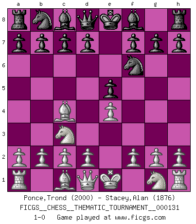 Last move : 1-0 2011 June 23 8:0:58 [Event "FICGS__CHESS__THEMATIC_TOURNAMENT__000131"] [Site "FICGS"] [Date "2011.05.13"] [Round "1"] [White "Ponce,Trond"] [Black "Stacey,Alan"] [Result "1-0"] [WhiteElo "2000"] [BlackElo "1876"] 1.e4 e5 2.Bc4 Nf6 3.Nc3 1-0 This chess game has been lost on time (started : 2011.05.13 21:5:15) Bishop's Opening : Berlin defense Player White won this chess game. Follow this game move after move (download)Modern Chess is too much concerned with things like Pawn structure. Forget it, Checkmate ends the game. (Nigel Short) Ein bischen Romantik kann weder im Schach noch in der Liebe schaden. Also versuche ich mich ab und zu daran zu erinnern. (Nigel Short) Alekhine es un poeta que crea un trabajo de arte de algo que raramente inspiraría a otra persona a mandar una tarjeta postal. (Max Euwe) Les Echecs représentent une sphère d'idées créatrices basée sur la volonté des deux protagonistes. (Smyslov) Hold em is to stud what chess is to checkers. (Johnny Moss)